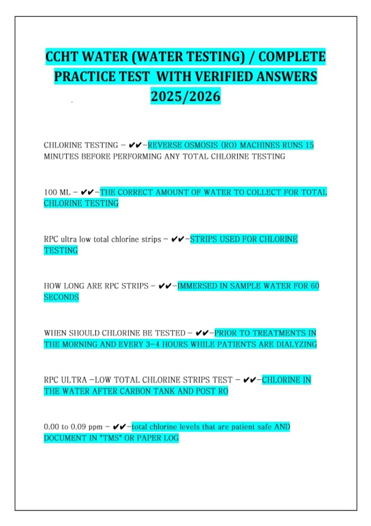 CCHT WATER (WATER TESTING) - COMPLETE PRACTICE TEST WITH VERIFIED ANSWERS