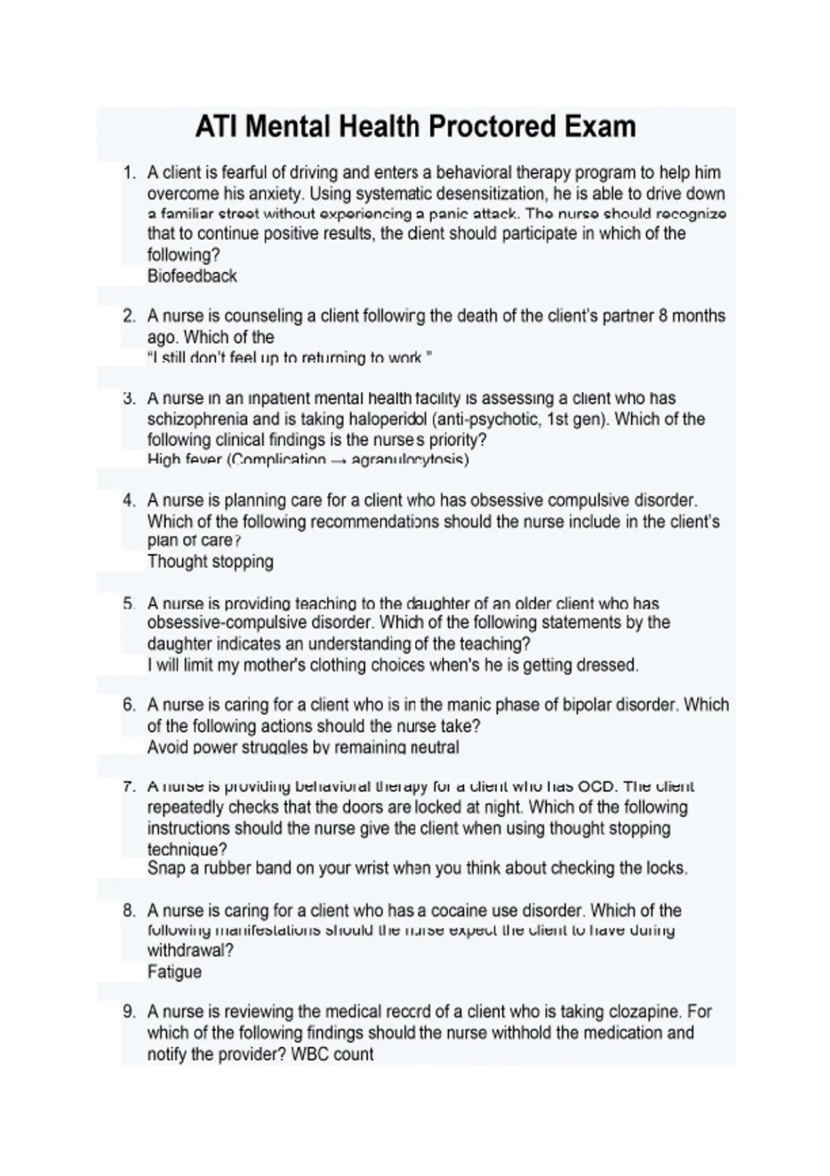 ATI Mental Health Proctored Exam 1. A client is fearful of driving and enters a behavioral therapy program to help him overcome his anxiety. Using systematic desensitization, he is able to drive down a familiar street without experiencing a panic attack. The nurse should recognize that to continue positive results, the client should participate in which of the following? Biofeedback 2. A nurse is counseling a client following the death of the client’s partner 8 months ago. Which of the “I still don’t feel up to returning to work.” 3. A nurse in an inpatient mental health facility is assessing a client who has schizophrenia and is taking haloperidol (anti-psychotic, 1st gen). Which of the following clinical findings is the nurse’s priority? High fever (Complication → agranulocytosis) 4. A nurse is planning care for a client who has obsessive compulsive disorder. Which of the following recommendations should the nurse include in the client’s plan of care? Thought stopping 5. A nurse is providing teaching to the daughter of an older client who has obsessive-compulsive disorder. Which of the following statements by the daughter indicates an understanding of the teaching? I will limit my mother's clothing choices when's he is getting dressed. 6. A nurse is caring for a client who is in the manic phase of bipolar disorder. Which of the following actions should the nurse take? Avoid power struggles by remaining neutral 7. A nurse is providing behavioral therapy for a client who has OCD. The client repeatedly checks that the doors are locked at night. Which of the following instructions should the nurse give the client when using thought stopping technique? Snap a rubber band on your wrist when you think about checking the locks. 8. A nurse is caring for a client who has a cocaine use disorder. Which of the following manifestations should the nurse expect the client to have during withdrawal? Fatigue 9. A nurse is reviewing the medical record of a client who is taking clozapine. For which of the following findings should the nurse withhold the medication and notify the provider? WBC count 10. A nurse is creating a plan of care for a client who has major depressive disorder. Which of the following interventions should the nurse include in the plan? Encourage physical activity for the client during the day.