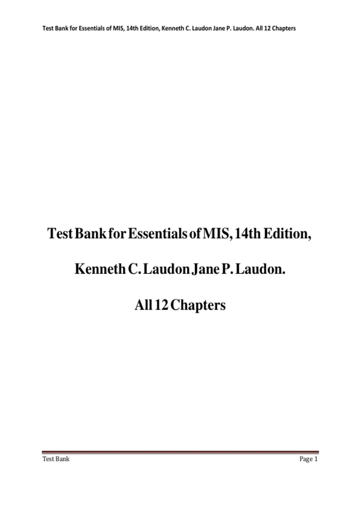 Complete test bank for Essentials of MIS, 14th Edition by Kenneth C. Laudon and Jane P. Laudon. This comprehensive resource includes all 12 chapters, featuring multiple-choice, true/false, and essay questions with verified answers. Ideal for students preparing for exams and instructors creating quizzes, tests, and assignments. Covers key MIS topics such as business objectives of IT, information systems in organizations, ethical and social issues, collaboration tools, competitive strategies, and more. Fully aligned with the textbook for accurate and reliable study support.