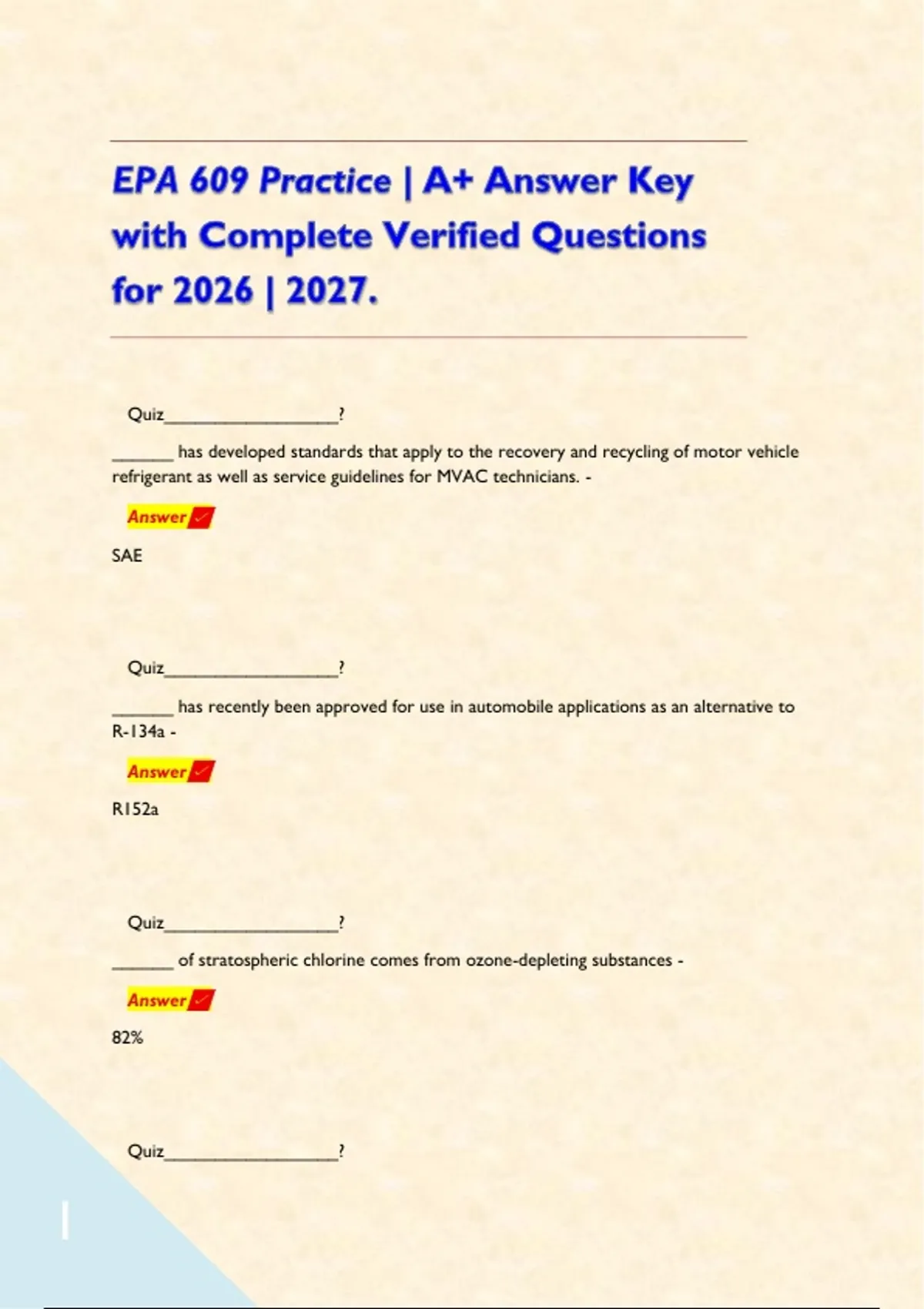 EPA 609 Practice | A+ Answer Key with Complete Verified Questions for 2026 | 2027. Quiz_________________? ______ has developed standards that apply to the recovery and recycling of motor vehicle refrigerant as well as service guidelines for MVAC technicians. - Answer SAE Quiz_________________? ______ has recently been approved for use in automobile applications as an alternative to R-134a - Answer R152a Quiz_________________? ______ of stratospheric chlorine comes from ozone-depleting substances - Answer 82% Quiz_________________? _______ has replaced CFC-12 in all automotive applications - Answer HFC-134a Quiz_________________? _______ is the key agent responsible for stratospheric ozone depletion - Answer chlorine monoxide Quiz_________________? A floor tax also applies to anyone holding ______ or more of the regulated CFCs - Answer 400 lb. Quiz_________________? A refillable refrigerant cylinder must not be filled above ______ of its full capacity. - Answer 80% Quiz_________________? According to ______, service shops must certify to the EPA that they own approved recovery equipment - Answer CAA Quiz_________________? After reaching the required recovery vacuum on an system, if the system pressure _____, indicating that there is either refrigerant in liquid form, refrigerant trapped in the oil, or a leak in the system. - Answer rises Quiz_________________? An award of up to ______ may be paid to a person supplying information that leads to a penalty against a technician who is intentionally venting. - Answer $10,000 Quiz_________________? Any person who sells or distributes any Class I or Class II substance in a container of less than _________ of such refrigerant must verify that the purchaser is Properly Trained and 609 Certified and must retain a record. - Answer 20 pounds Quiz_________________? As per the CAA, all records related to entities of MVAC system services must be maintained for ________ years - Answer 3 Quiz_________________? At high temperatures, CFC-12 can decompose to form _______ - Answer hydrochloric and hydrofluoric acid Quiz_________________? At present there is no restriction on the sale of HFC-134a - Answer True Quiz_________________? Average ozone concentration in Earth's atmosphere as a whole is only about ______ parts per million - Answer 0.3