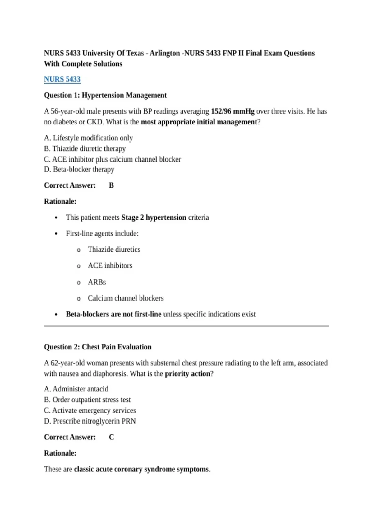 NURS 5433 University Of Texas - Arlington -NURS 5433 FNP II Final Exam Questions