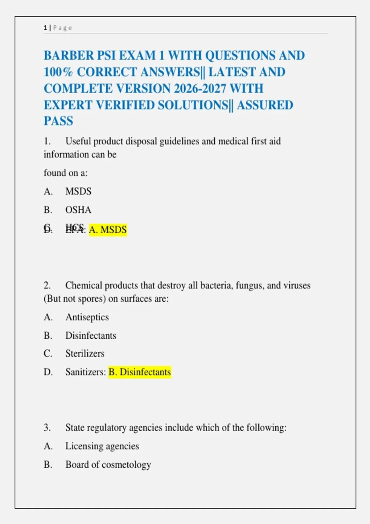 BARBER PSI EXAM 1 WITH QUESTIONS AND