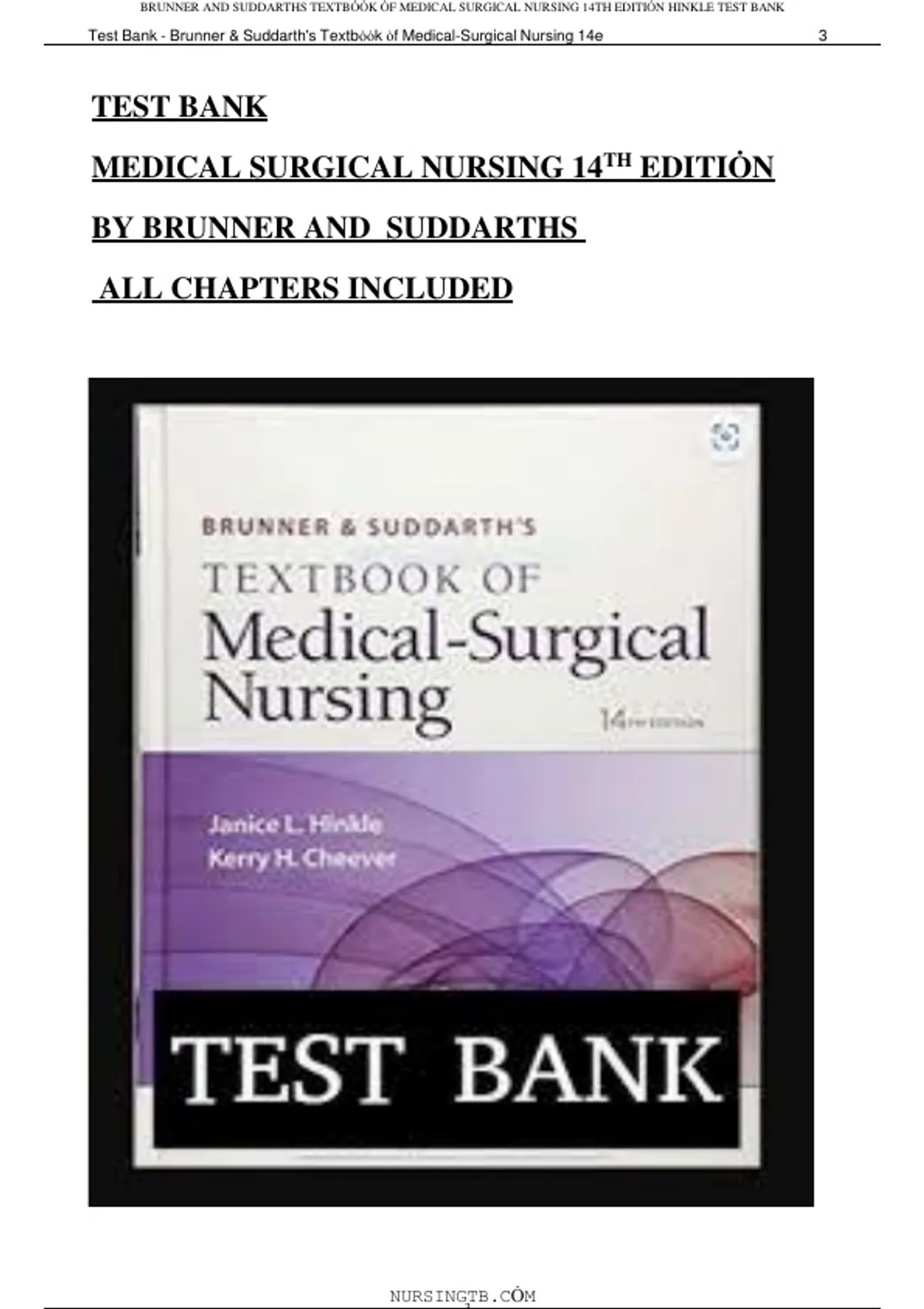 , BRUNNER AND SUDDARTHS TEXTBȮȮK ȮF MEDICAL SURGICAL NURSING 14TH EDITIȮN HINKLE TEST BANK