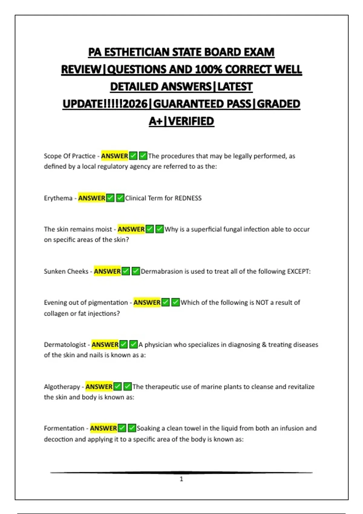 PA ESTHETICIAN STATE BOARD EXAM REVIEW|QUESTIONS AND 100% CORRECT WELL DETAILED ANSWERS|LATEST UPDATE!!!!!2026|GUARANTEED PASS|GRADED A+|VERIFIED