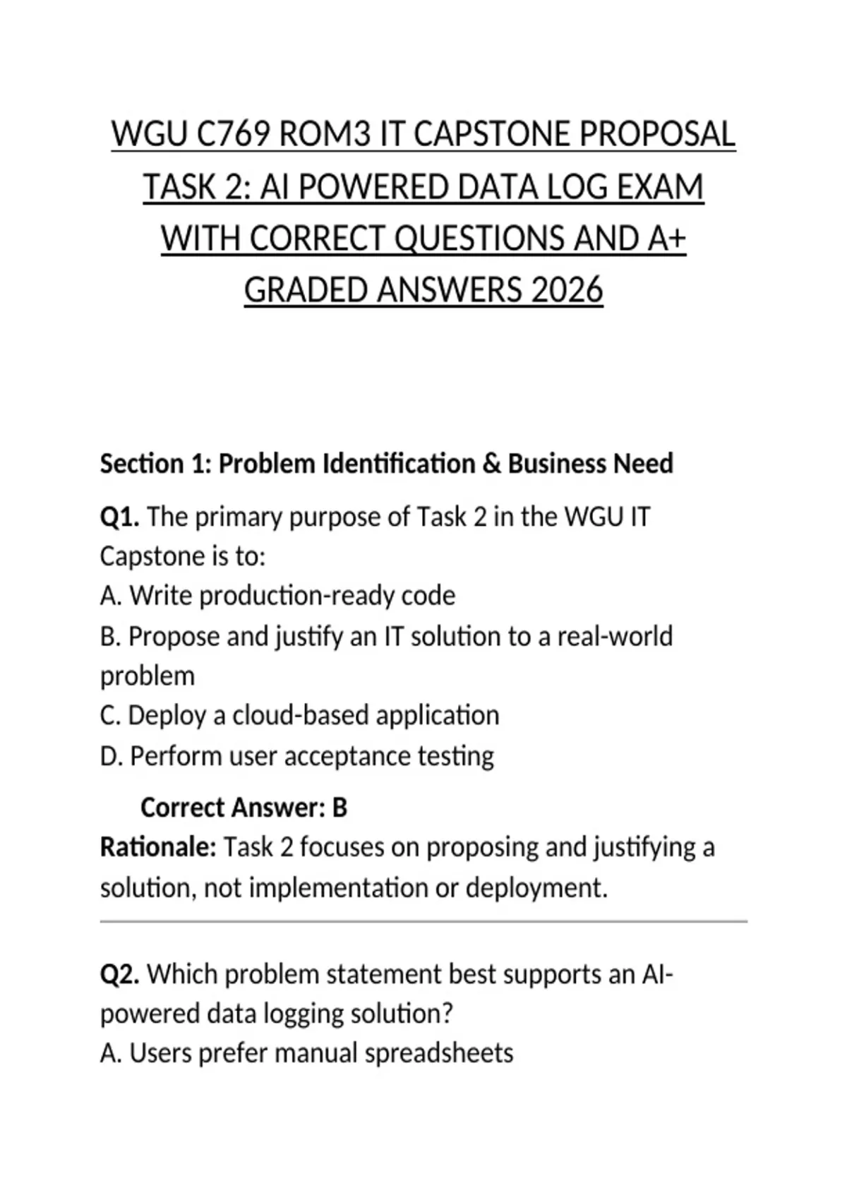 WGU C769 ROM3 IT CAPSTONE PROPOSAL TASK 2: AI POWERED DATA LOG QUESTIONS AND ANSWERS 2026 UPDATE A+ GRADED