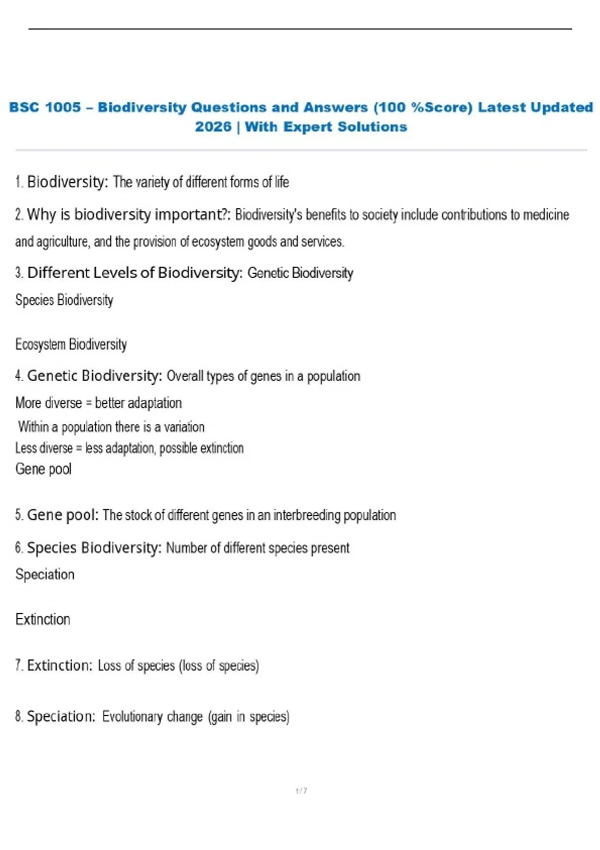 BSC 1005 – Biodiversity Questions and Answers (100 %Score) Latest Updated 2026 | With Expert Solutions