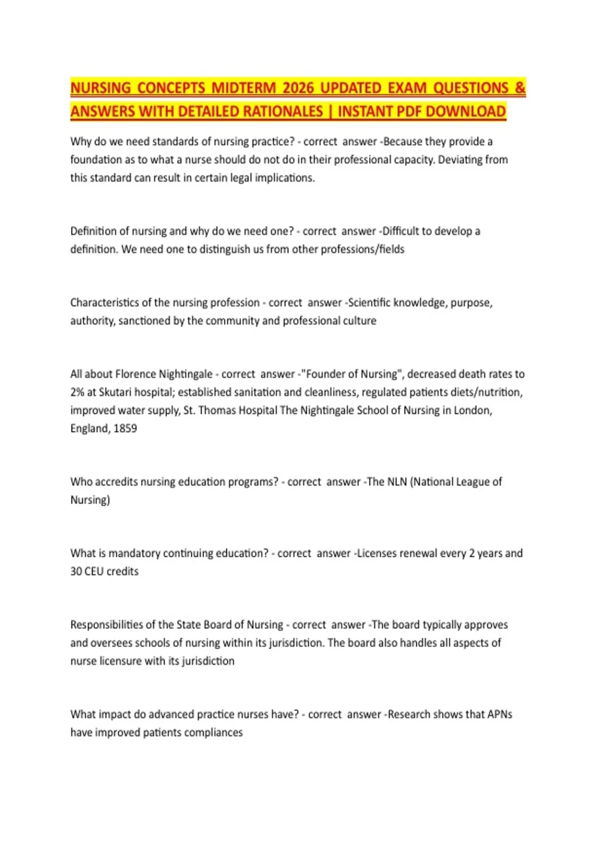 NURSING CONCEPTS MIDTERM 2026 UPDATED EXAM QUESTIONS & ANSWERS WITH DETAILED RATIONALES | INSTANT PDF DOWNLOAD