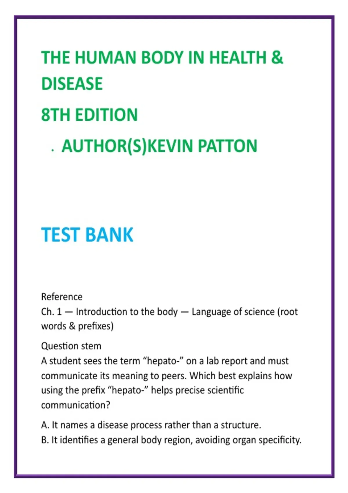 Human Body in Health & Disease Test Bank (8th Ed) | Kevin Patton | Anatomy & Physiology Nursing MCQs 2026 2️⃣ SEO Product Description (200–300 words) Master anatomy and physiology with confidence using this comprehensive digital test bank developed directly from Kevin Patton’s The Human Body in Health & Disease, 8th Edition, a cornerstone textbook for nursing and allied health education. This professionally written resource provides full textbook coverage across all units and chapters, with 20 high-quality multiple-choice questions (MCQs) per chapter, each paired with clear, evidence-based rationales. Questions are concept-focused and application-driven, helping learners understand normal structure and function, recognize early pathophysiologic changes, and strengthen clinical correlation skills essential for health sciences courses. Designed specifically for Anatomy & Physiology I & II, Human Biology, Foundations of Health Sciences, Pre-Nursing, and Allied Health programs, this test bank supports students preparing for exams that demand concept mastery rather than memorization. The questions reinforce homeostasis, body system integration, and structure–function relationships, building a strong foundation for future clinical coursework. What’s Included: Full-chapter coverage of The Human Body in Health & Disease (8th Edition) 20 exam-relevant MCQs per chapter Correct answers with concise, educational rationales Concept-based and introductory clinical-style questions Ideal for nursing, PN/LPN, MA, OTA, PTA, and allied health students Digital format for fast, flexible study and review This test bank is an ethical study aid, not an official exam, created to save time, reinforce learning, and improve performance in anatomy & physiology–based assessments. 3️⃣ 8 High-Value SEO Keywords human body in health and disease test bank kevin patton anatomy test bank anatomy and physiology nursing mcqs a&p nursing study guide anatomy physiology test bank pdf nursing anatomy test questions human biology anatomy test bank allied health anatomy physiology exams 4️⃣ 10 Hashtags #AnatomyAndPhysiology #NursingEducation #APTestBank #PreNursing #AlliedHealthStudents #HumanBiology #NursingFundamentals #HealthSciences #StudyGuide #ExamPrep