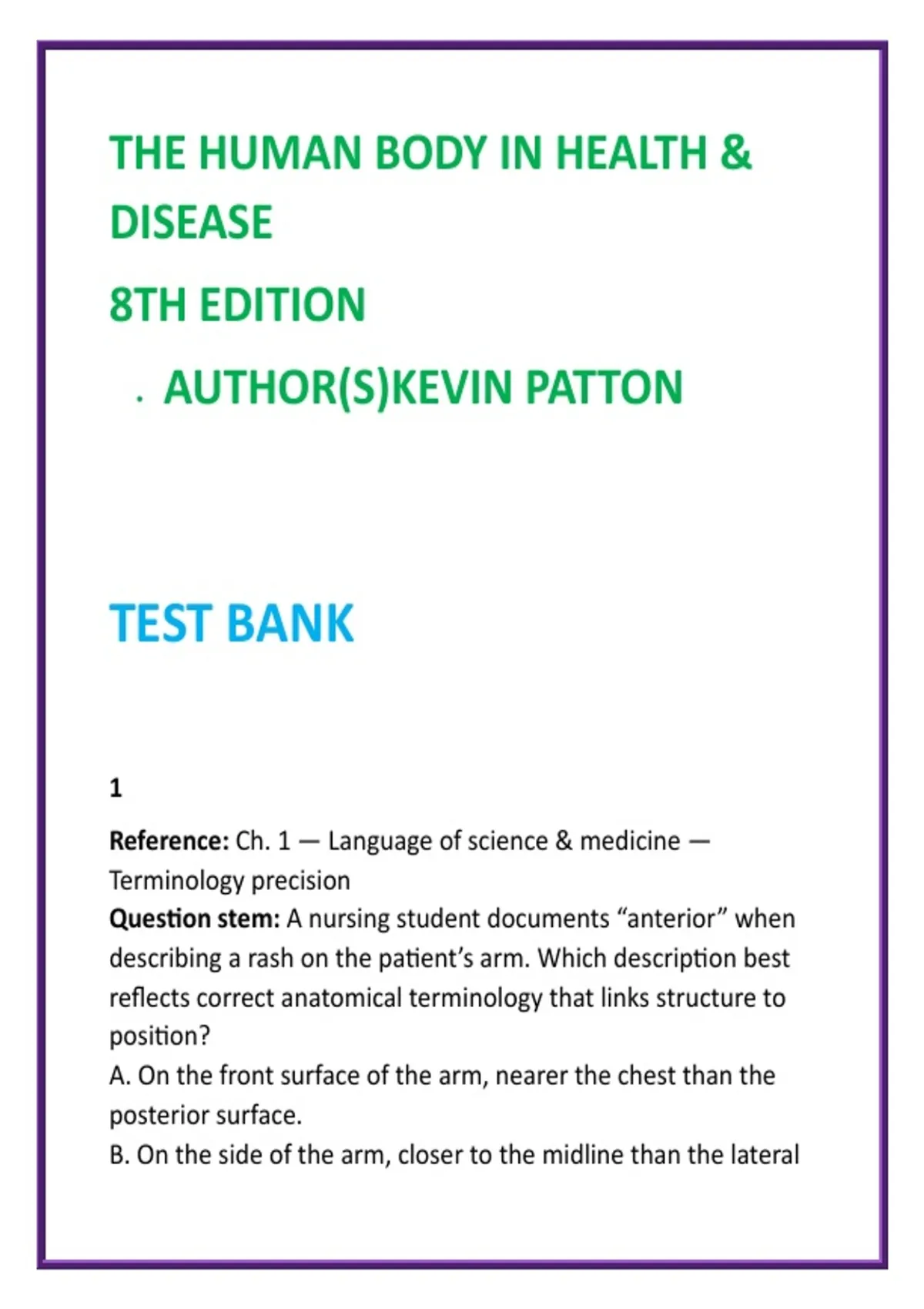 Human Body in Health & Disease Test Bank | Kevin Patton 8th Ed | Nursing A&P MCQs | Nursing Test Bank 2026 2️⃣ SEO Product Description (200–300 words) Master Anatomy & Physiology with confidence using this comprehensive Nursing & Allied Health Test Bank developed from Kevin Patton’s The Human Body in Health & Disease (8th Edition)—one of the most trusted foundational texts in health sciences education. This digital resource provides full textbook coverage of all units and chapters, with 20 concept-driven, exam-relevant multiple-choice questions (MCQs) per chapter, each paired with clear, evidence-based rationales. Questions are designed to reinforce normal vs. abnormal physiology, structure–function relationships, and introductory pathophysiology—making it ideal for students transitioning from theory to clinical understanding. Built for Anatomy & Physiology I & II, Human Biology, Foundations of Health Sciences, Pre-Nursing, and Allied Health programs, this test bank supports efficient exam preparation while strengthening long-term retention of complex A&P concepts. Content is academically ethical, copyright-safe, and intended strictly as a study aid, not official exams. What’s Included: Full-chapter coverage of The Human Body in Health & Disease (8th Ed.) 20 high-quality MCQs per chapter Detailed rationales explaining correct and incorrect options Concept-based and clinical-style questions Focus on homeostasis, body systems, and disease foundations Ideal for A&P, pre-nursing, and allied health coursework Learning Outcomes: Improve understanding of human body systems Strengthen clinical correlation and reasoning skills Increase exam confidence and assessment performance Save time with structured, exam-focused practice A reliable, high-yield study companion for serious A&P and nursing students. 3️⃣ 8 High-Value SEO Keywords human body in health and disease test bank kevin patton anatomy test bank anatomy and physiology nursing mcqs a&p nursing study guide nursing test bank 2026 allied health anatomy test bank human biology anatomy mcqs pre nursing anatomy physiology test bank 4️⃣ 10 Hashtags #AnatomyAndPhysiology #NursingEducation #APNursing #TestBank #AlliedHealthStudents #PreNursing #HumanBiology #NursingStudyGuide #HealthSciences #ExamPrep