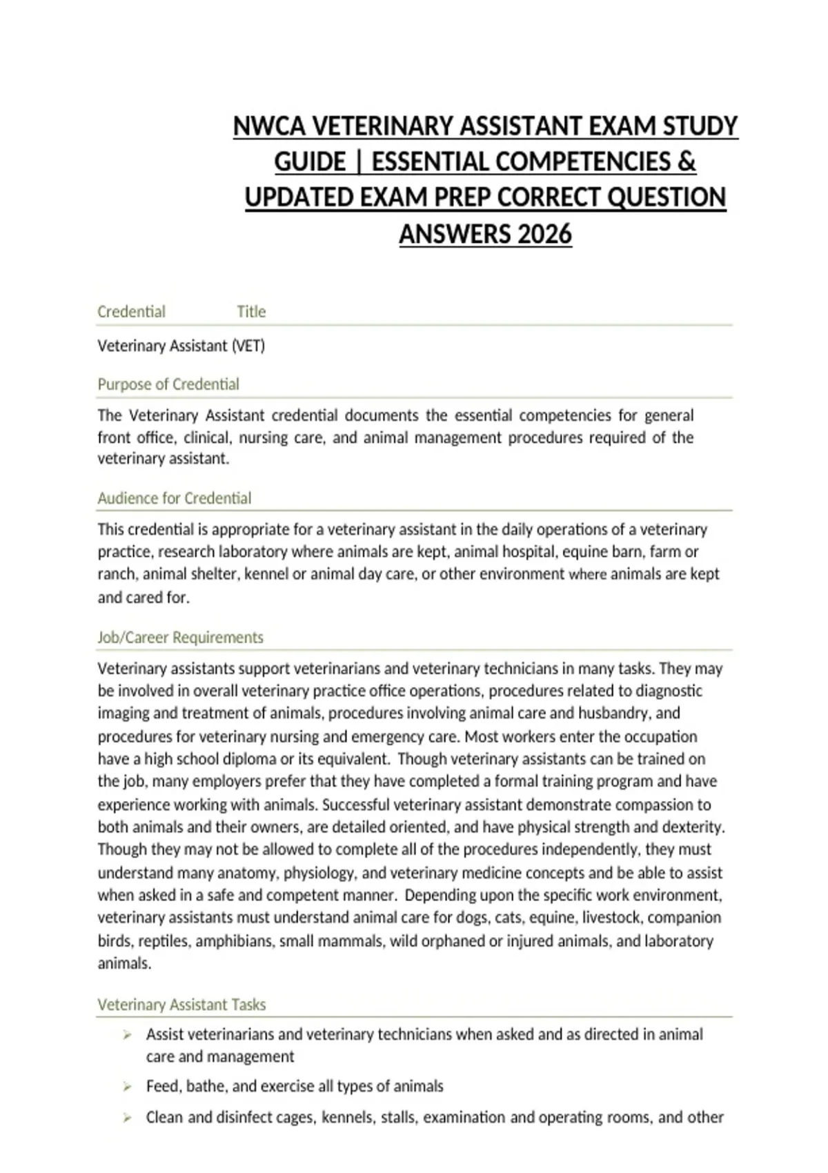 NWCA VETERINARY ASSISTANT EXAM STUDY GUIDE | ESSENTIAL COMPETENCIES & UPDATE EXAM PREP CORRECT QUESTION AND ANSWERS 2026
