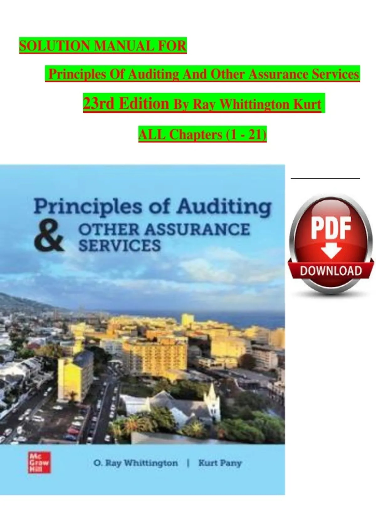Achieve success in auditing courses with this comprehensive solution manual for Principles of Auditing and Other Assurance Services, 23rd Edition, fully updated for 2026. Designed to support the textbook by Ray Whittington and Kurt, this manual provides clear, accurate, step-by-step solutions and explanations to help students master auditing theory and practical application. The solution manual covers key topics including the auditing profession, audit planning, risk assessment, internal controls, audit evidence, sampling, revenue and expenditure cycles, ethics and professional responsibility, assurance services, and audit reporting. Content is aligned chapter-by-chapter with the textbook, making it ideal for homework, assignments, quizzes, and exam preparation. Detailed explanations and worked solutions Chapter-aligned for easy reference Ideal for accounting, auditing, and business programs Supports exam readiness and concept mastery A dependable study companion for understanding auditing principles and achieving strong academic performance.