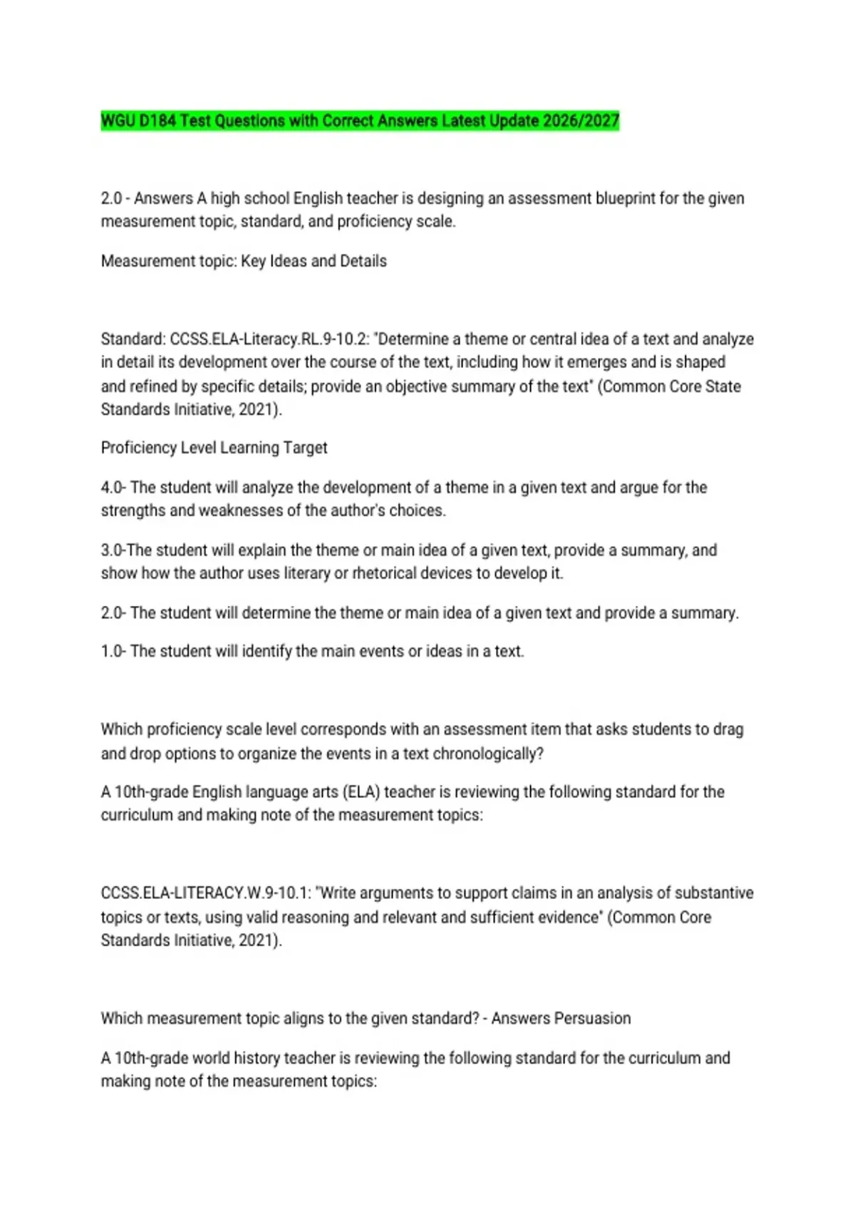WGU D184 Test Questions with Correct Answers Latest Update 2026/2027 2.0 - Answers A high school English teacher is designing an assessment blueprint for the given measurement topic, standard, and proficiency scale. Measurement topic: Key Ideas and Details Standard: CCSS.ELA-Literacy.RL.9-10.2: "Determine a theme or central idea of a text and analyze in detail its development over the course of the text, including how it emerges and is shaped and refined by specific details; provide an objective summary of the text" (Common Core State Standards Initiative, 2021). Proficiency Level Learning Target 4.0- The student will analyze the development of a theme in a given text and argue for the strengths and weaknesses of the author's choices. 3.0-The student will explain the theme or main idea of a given text, provide a summary, and show how the author uses literary or rhetorical devices to develop it. 2.0- The student will determine the theme or main idea of a given text and provide a summary. 1.0- The student will identify the main events or ideas in a text. Which proficiency scale level corresponds with an assessment item that asks students to drag and drop options to organize the events in a text chronologically? A 10th-grade English language arts (ELA) teacher is reviewing the following standard for the curriculum and making note of the measurement topics: CCSS.ELA-LITERACY.W.9-10.1: "Write arguments to support claims in an analysis of substantive topics or texts, using valid reasoning and relevant and sufficient evidence" (Common Core Standards Initiative, 2021). Which measurement topic aligns to the given standard? - Answers Persuasion A 10th-grade world history teacher is reviewing the following standard for the curriculum and making note of the measurement topics: