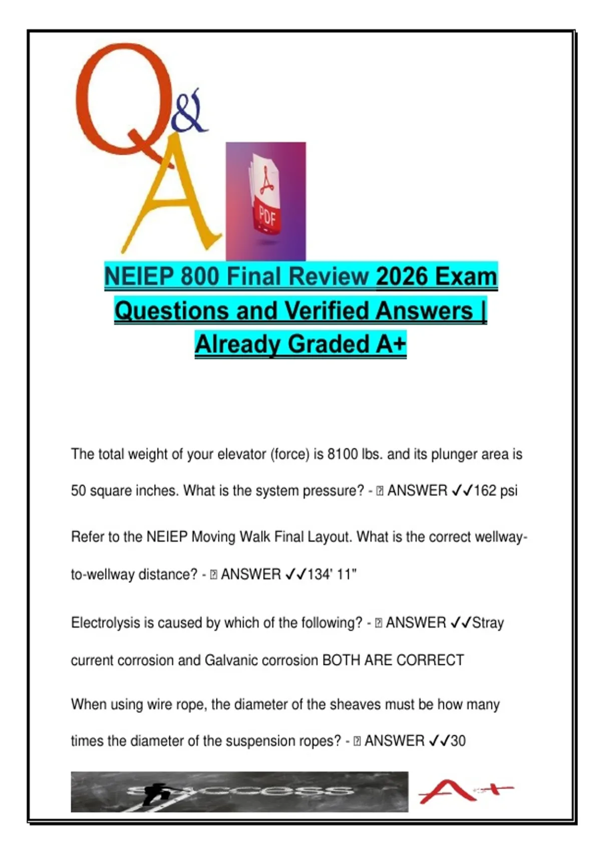 This document is a comprehensive final exam review for NEIEP 800, specifically designed for the 2026 academic year. It contains verified multiple-choice questions and correct answers covering a wide range of elevator and escalator systems topics. Areas include hydraulic calculations, safety protocols, wiring standards, layout measurements, AC motor control, ASME code references, and troubleshooting scenarios. Ideal for students and professionals preparing for NEIEP certification assessments. Keywords: hydraulic pressure calculation moving walk layout electrolysis causes wire rope sheave ratio wye-delta starter contact interlocking plunger diameter elevator safety codes LULA elevator specs pressure relief test escalator step speed rack and pinion scavenger pump platform lift positive displacement pump chairlift installation governor safety device submersible pump flex oil line replacement lockout tagout safety