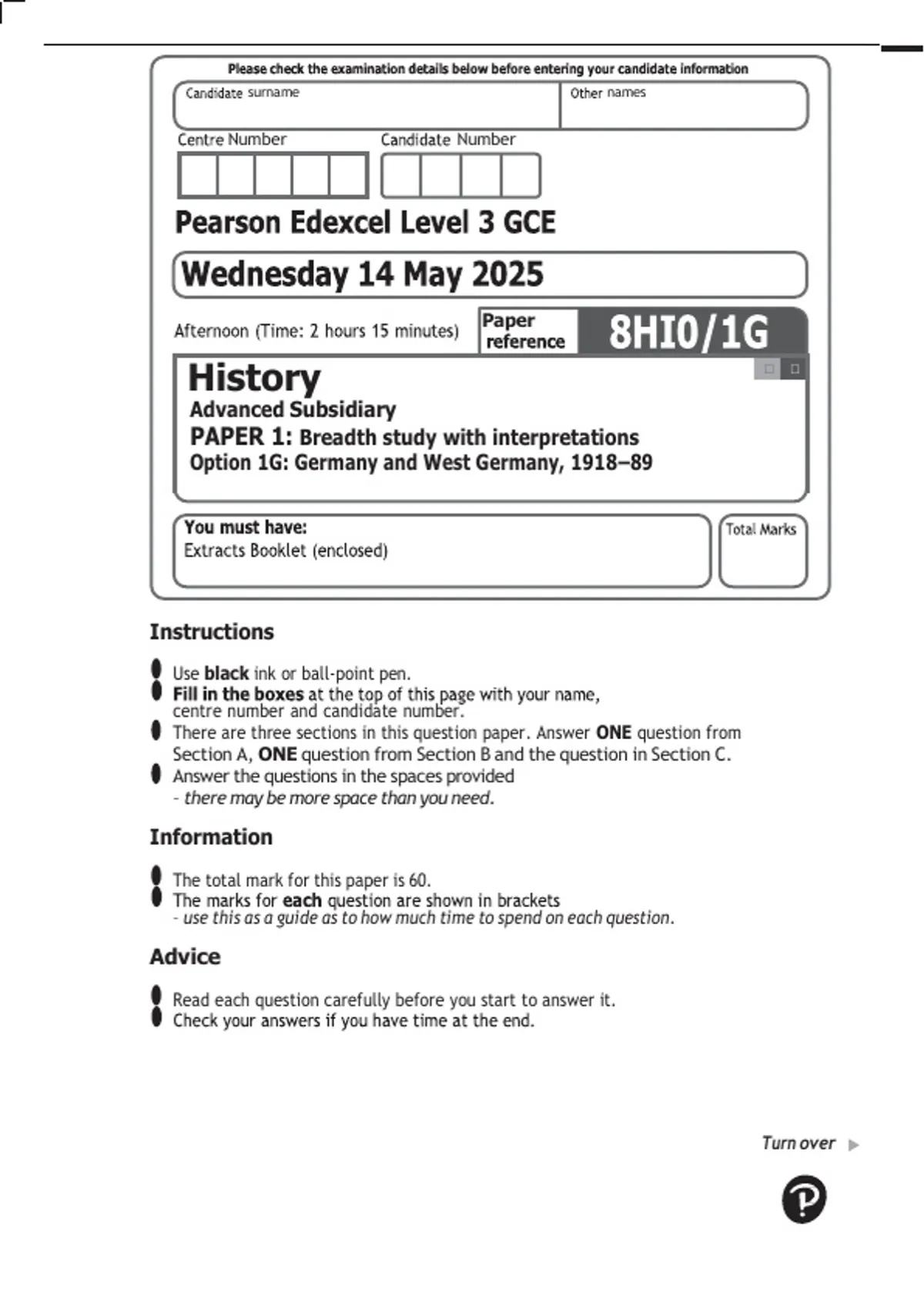 Pearson Edexcel In GCE History (8HI0/1G) Advanced Subsidiary Paper 1: Breadth study with interpretations Option 1G: Germany and West Germany, 1918–89 2025 ACTUAL QUESTION PAPER AND MARKING SCHEME MERGED