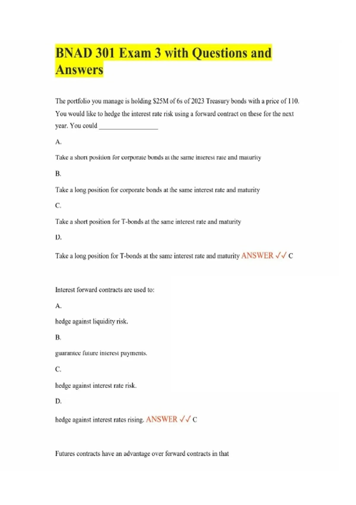 BNAD 301 Exam 3 with Questions and Answers The portfolio you manage is holding $25M of 6s of 2023 Treasury bonds with a price of 110. You would like to hedge the interest rate risk using a forward contract on these for the next year. You could __________________ A. Take a short position for corporate bonds at the same interest rate and maturity B. Take a long position for corporate bonds at the same interest rate and maturity C. Take a short position for T-bonds at the same interest rate and maturity D. Take a long position for T-bonds at the same interest rate and maturity ANSWER C Interest forward contracts are used to: A. hedge against liquidity risk. B. guarantee future interest payments. C. hedge against interest rate risk. D. hedge against interest rates rising. ANSWER C Futures contracts have an advantage over forward contracts in that A. the price of the futures contract diverges from the price of the underlying asset to be delivered. B. they specify that a financial instrument must be delivered by one party to another. C. they are not subject to default risk and are more liquid. D. the contract expires one year in the future. ANSWER