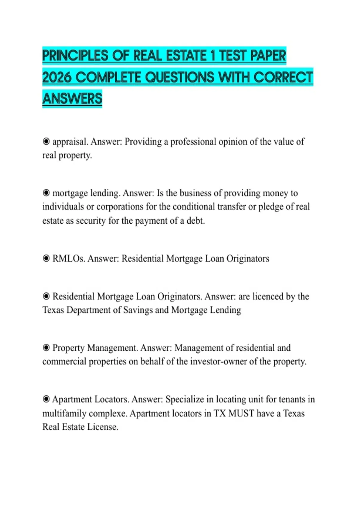 PRINCIPLES OF REAL ESTATE 1 TEST PAPER 2026 COMPLETE QUESTIONS WITH CORRECT ANSWERS