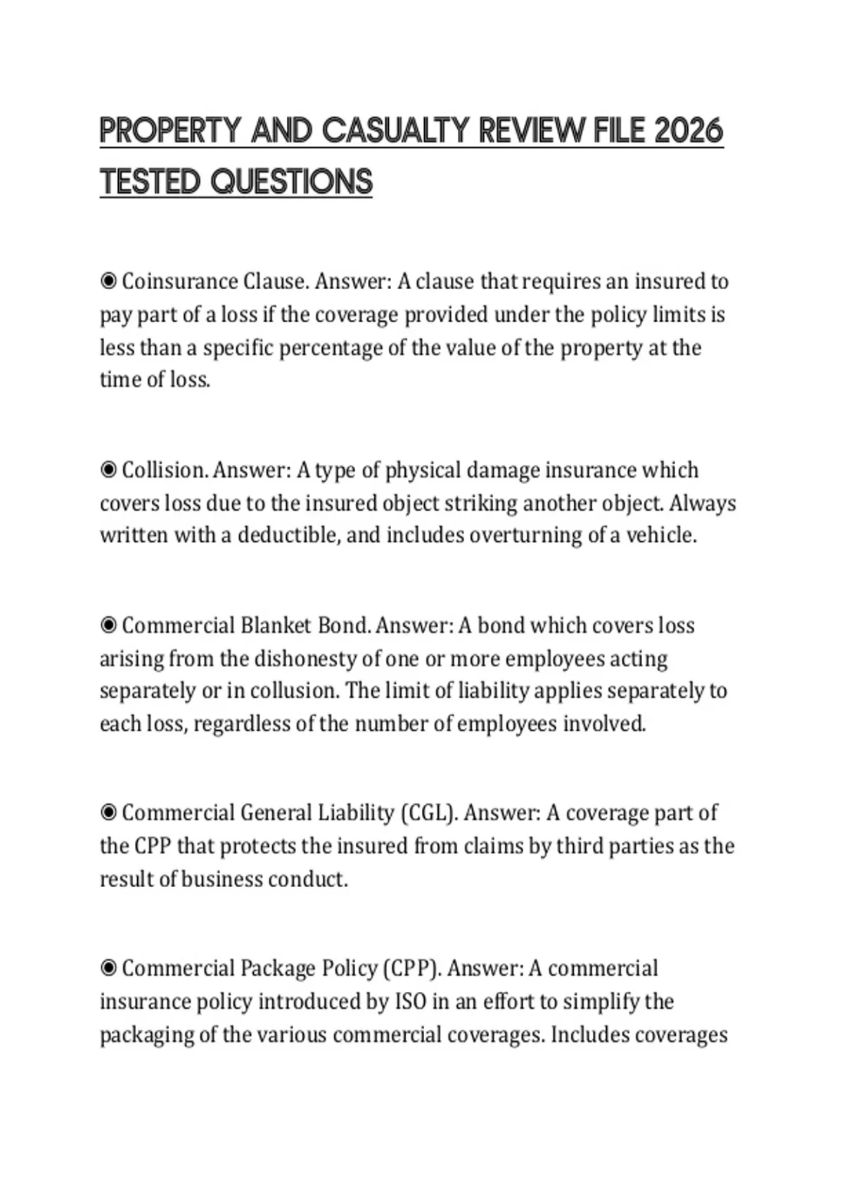 ◉ Coinsurance Clause. Answer: A clause that requires an insured to