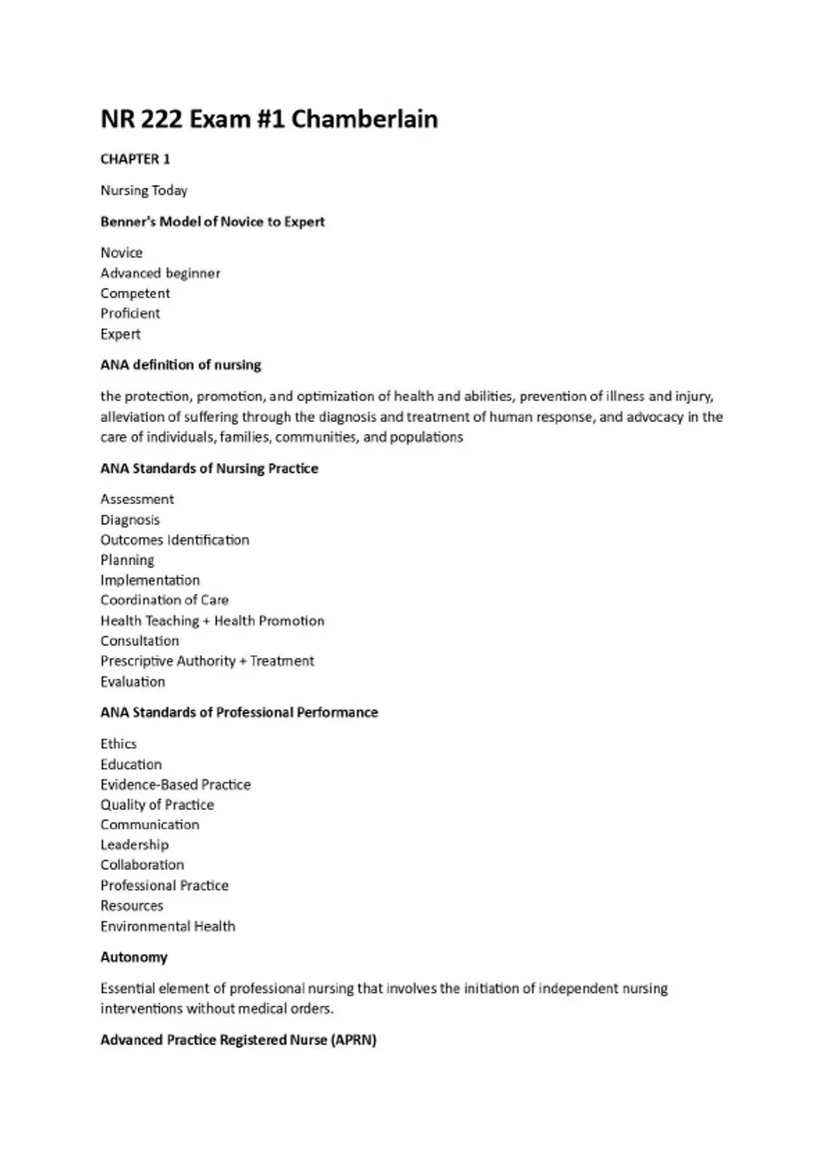 CHAPTER 1 Nursing Today Benner's Model of Novice to Expert Novice Advanced beginner Competent Proficient Expert ANA definition of nursing the protection, promotion, and optimization of health and abilities, prevention of illness and injury, alleviation of suffering through the diagnosis and treatment of human response, and advocacy in the care of individuals, families, communities, and populations ANA Standards of Nursing Practice Assessment Diagnosis Outcomes Identification Planning Implementation Coordination of Care Health Teaching + Health Promotion Consultation Prescriptive Authority + Treatment Evaluation ANA Standards of Professional Performance Ethics Education Evidence-Based Practice Quality of Practice Communication Leadership Collaboration Professional Practice Resources Environmental Health Autonomy Essential element of professional nursing that involves the initiation of independent nursing interventions without medical orders. Advanced Practice Registered Nurse (APRN)