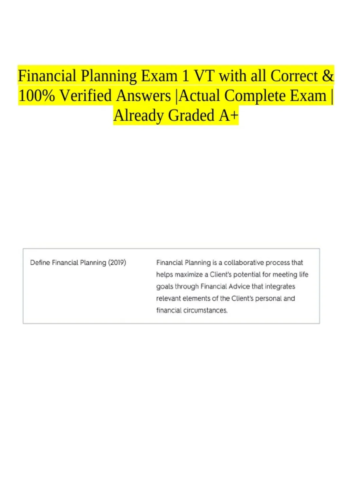 Financial Planning Exam 1 VT with all Correct & 100% Verified Answers |Actual Complete Exam |Already Graded A+