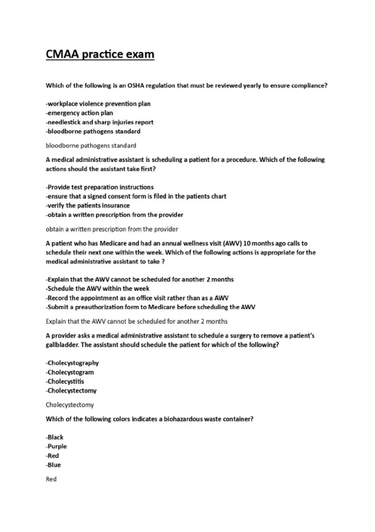 Which of the following is an OSHA regulation that must be reviewed yearly to ensure compliance? -workplace violence prevention plan -emergency action plan -needlestick and sharp injuries report -bloodborne pathogens standard bloodborne pathogens standard A medical administrative assistant is scheduling a patient for a procedure. Which of the following actions should the assistant take first? -Provide test preparation instructions -ensure that a signed consent form is filed in the patients chart -verify the patients insurance -obtain a written prescription from the provider obtain a written prescription from the provider A patient who has Medicare and had an annual wellness visit (AWV) 10 months ago calls to schedule their next one within the week. Which of the following actions is appropriate for the medical administrative assistant to take ? -Explain that the AWV cannot be scheduled for another 2 months -Schedule the AWV within the week -Record the appointment as an office visit rather than as a AWV -Submit a preauthorization form to Medicare before scheduling the AWV Explain that the AWV cannot be scheduled for another 2 months A provider asks a medical administrative assistant to schedule a surgery to remove a patient's gallbladder. The assistant should schedule the patient for which of the following? -Cholecystography -Cholecystogram -Cholecystitis -Cholecystectomy Cholecystectomy Which of the following colors indicates a biohazardous waste container? -Black -Purple -Red -Blue Red