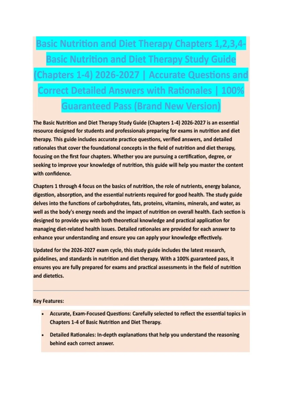 The Basic Nutrition and Diet Therapy Study Guide (Chapters 1-4) 2026-2027 is an essential