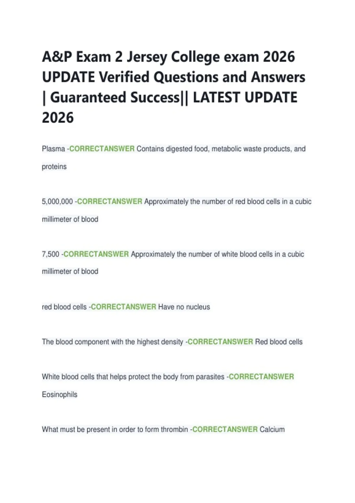 A&P Exam 2 Jersey College exam 2026 UPDATE Verified Questions and Answers | Guaranteed Success|| LATEST UPDATE 2026