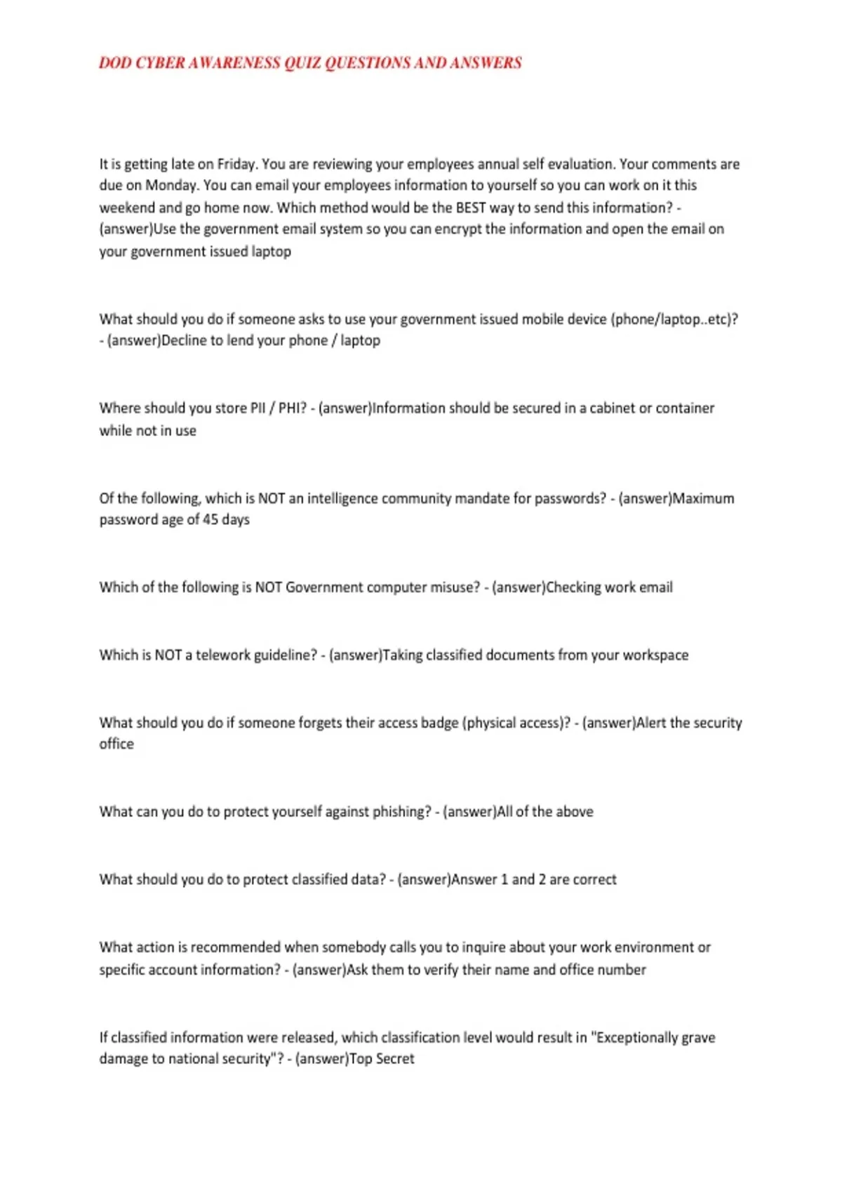 DOD CYBER AWARENESS QUIZ QUESTIONS AND ANSWERS