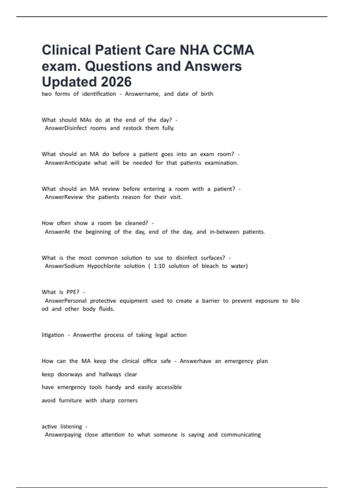 Clinical Patient Care NHA CCMA exam. Questions and Answers Updated 2026