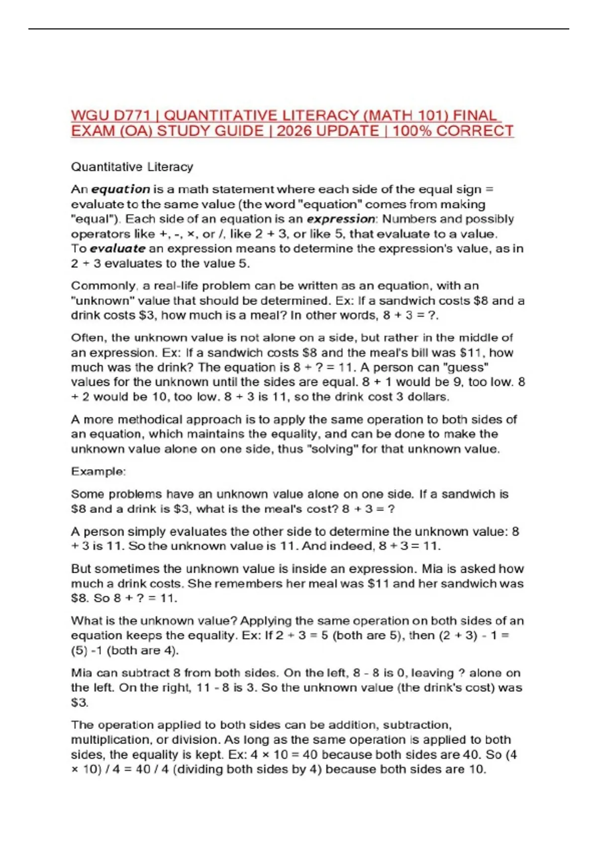 WGU D771 | QUANTITATIVE LITERACY (MATH 101) FINAL EXAM (OA) STUDY GUIDE | 2026 UPDATE | 100% CORRECT