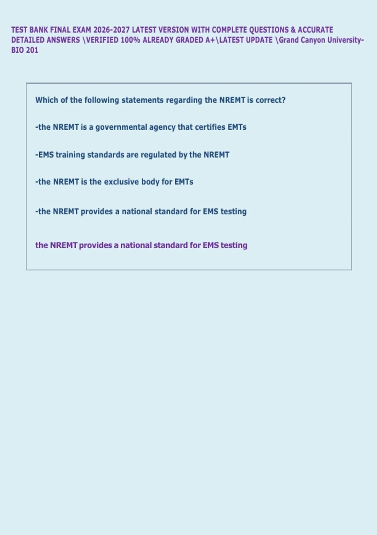 TEST BANK FINAL EXAM LATEST VERSION WITH COMPLETE QUESTIONS & ACCURATE DETAILED ANSWERS VERIFIED 100% ALREADY GRADED A+LATEST UPDATE Grand Canyon University BIO 201 Which of the following statements regarding the NREMT is correct? -the NREMT is a governmental agency that certifies EMTs -EMS training standards are regulated by the NREMT -the NREMT is the exclusive body for EMTs -the NREMT provides a national standard for EMS testing the NREMT provides a national standard for EMS testing The determination that prompt surgical care in the hospital is more important than performing time-consuming procedures in the field on a major trauma patient is based MOSTLY on: -regional trauma guidelines -the lead EMT's decision -local protocols -EMS research EMS research Which of the following is a specific example of the Mobile Integrated Healthcare (MIH) model? -paramedics pick up a patient from an acute care clinic -EMTs respond to a woman who complains of high fever -EMTs assess a patient whose lung disease is "acting up" -the paramedic administers a patient's flu vaccination the paramedic administers a patient's flu vaccination Which of the following interventions is used by all levels if EMS providers? -needle decompression -automatic transport ventilators -multilumen airways -automated external defibrillator automated external defibrillator You are encouraging a patient to go to the hospital by ambulance. You know that a transport will keep you on duty several hours after your regular quitting time. This is an example of _______ _. -undue hardship -scope of practice -patient advocacy -abuse of authority patient advocacy The ability to handle multiple tasks based on their priority is called ________ _. -time management -patient empathy -integrity -patient advocacy time management Prehospital patient care decisions should be based on _______ _. -the experiences of EMTs -the opinions of physicians -an EMS agency's fiscal resources -EMS research EMS research You are caring for a driver who struck a light pole. She admits to drinking alcohol but orders you not to tell anyone. You should report the information to _. -law enforcement personnel -your medical director -the state motor vehicle department -the receiving nurse or doctor the receiving nurse or doctor The ability to take appropriate action with little direction is known as _______ _. -time management -self-motivation -self-confidence -diplomacy self-motivation Which of the following statements regarding the Americans with Disabilities Act (ADA) of 1990 is correct? -according to the ADA, EMT candidates with a documented disability are exempt from taking the NREMT exam -the ADA applies only to individuals with a diagnosed and well-documented physical disability -the minimum number of hours required to successfully complete an EMT course is less for candidates who are disabled -the ADA prohibits employers from failing to provide full and equal employment to those who are disabled the ADA prohibits employers from failing to provide full and equal employment to those who are disabled