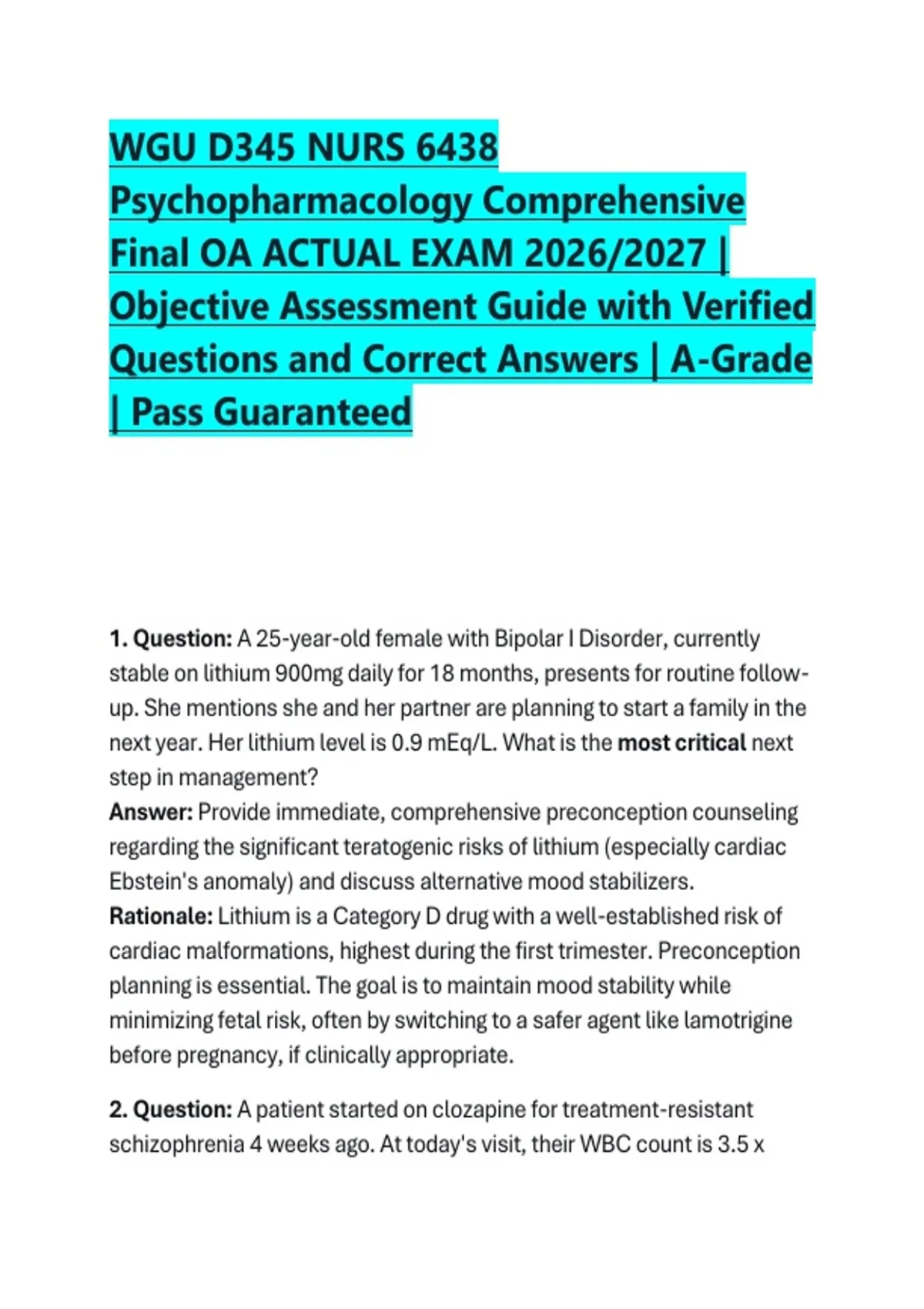 WGU D345 NURS 6438 Psychopharmacology Comprehensive Final OA ACTUAL EXAM 2026/2027 | Objective Assessment Guide with Verified Questions and Correct Answers | A-Grade | Pass Guaranteed