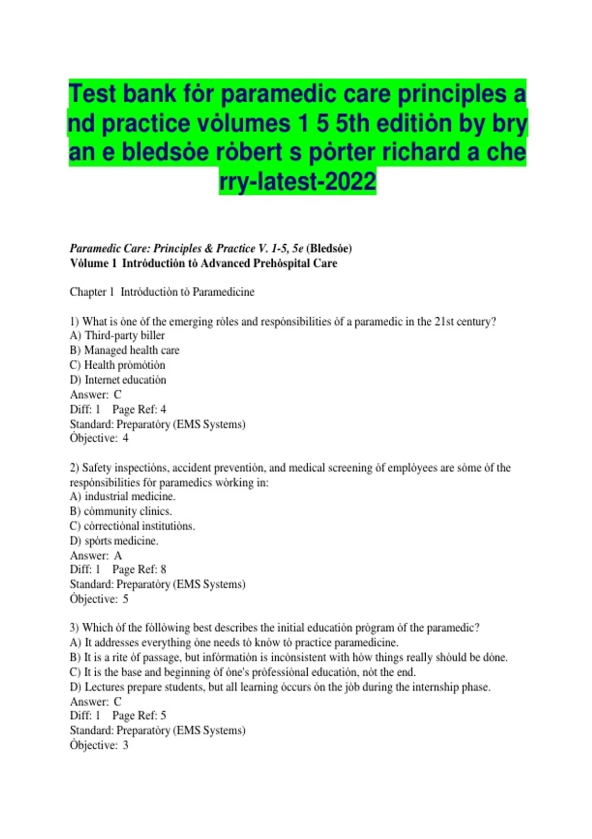 This Test Bank for Paramedic Care: Principles and Practice, Volumes 1–5 (5th Edition, ISBN 9780134575964) by Bryan E. Bledsoe, Robert S. Porter, and Richard A. Cherry is a comprehensive practice resource designed for paramedic students and EMS trainees. Covering all five volumes and chapters, it includes extensive chapter-by-chapter questions with verified answers, spanning foundational EMS principles, patient assessment, medical and trauma emergencies, operations, pharmacology, and special considerations in prehospital care. Ideal for coursework review, certification prep, quizzes, and self-assessment, this PDF resource supports mastery of essential concepts and boosts exam confidence.