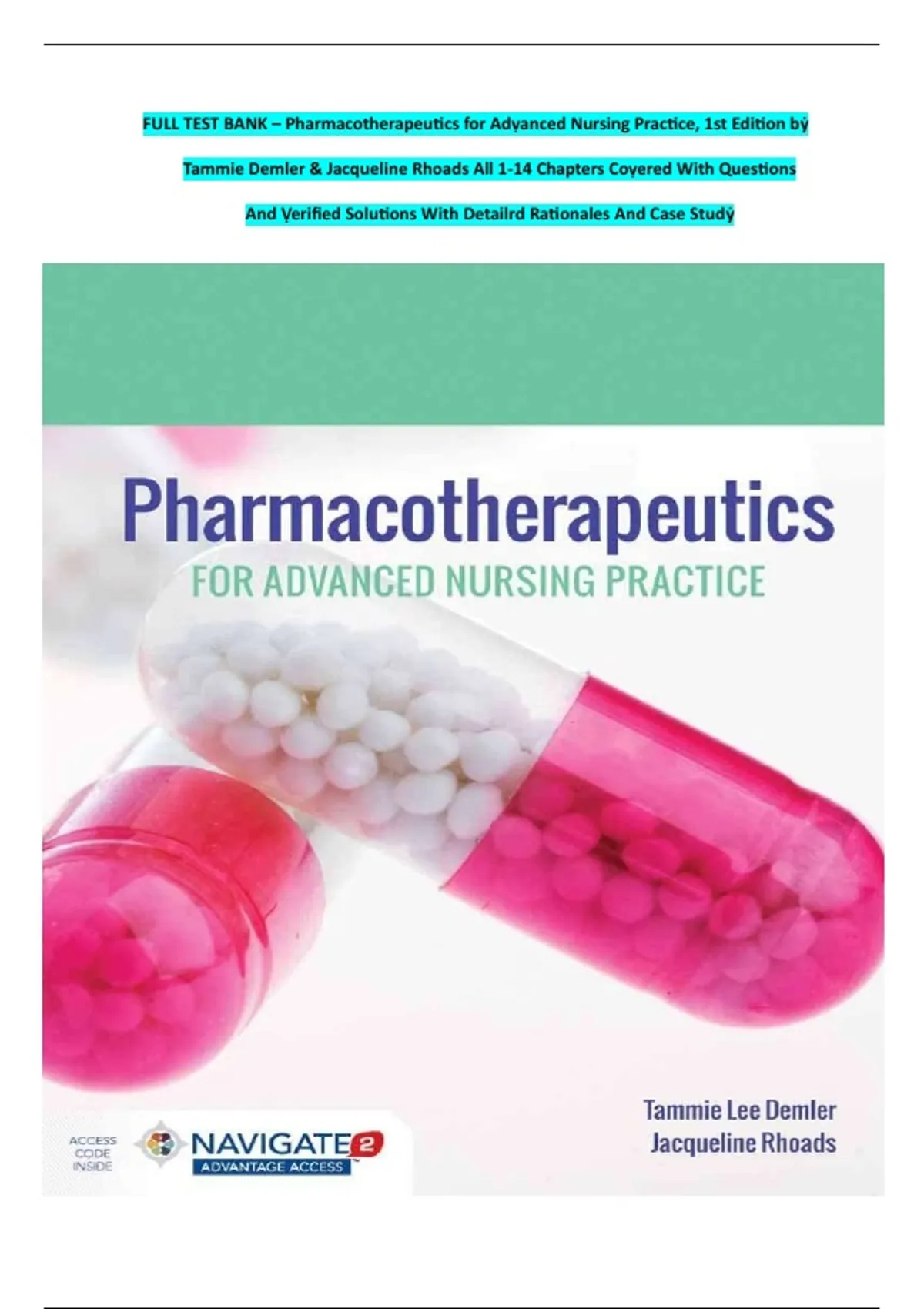 Comprehensive Study Resource for Advanced Nursing Practice Unlock the full potential of your advanced nursing education with the Pharmacotherapeutics for Advanced Nursing Practice, 1st Edition by Tammie Demler & Jacqueline Rhoads. This essential study tool is meticulously crafted to provide a deep understanding of pharmacotherapeutics, tailored specifically for nursing professionals aiming to excel in their field. Key Features: Inclusive Coverage: Spanning all 14 chapters, this resource ensures no topic is left unexplored. From foundational principles to complex case studies, every aspect is covered in detail. Verified Solutions: Gain confidence with solutions that have been thoroughly verified, allowing you to trust in their accuracy as you prepare for exams or clinical applications. Detailed Rationales: Each question is accompanied by comprehensive rationales, offering insight into the reasoning behind answers and enhancing your critical thinking skills. Engaging Case Studies: Apply your knowledge in real-world scenarios with thoughtfully designed case studies that mirror actual clinical situations, preparing you for practical application in the workforce. Unique Benefits: Advanced Understanding: Dive deeper into pharmacotherapeutics with expertly crafted questions that challenge and expand your knowledge base. Time Efficiency: Streamline your study sessions with a focused resource that saves time by eliminating the need to search for multiple study aids. Professional Edge: Stand out in your nursing practice with advanced knowledge that improves patient care and professional decision-making skills. Invest in your future by equipping yourself with the tools necessary for success in advanced nursing. The Pharmacotherapeutics for Advanced Nursing Practice test bank is more than a study guide—it's a pivotal resource for your educational journey and career advancement.