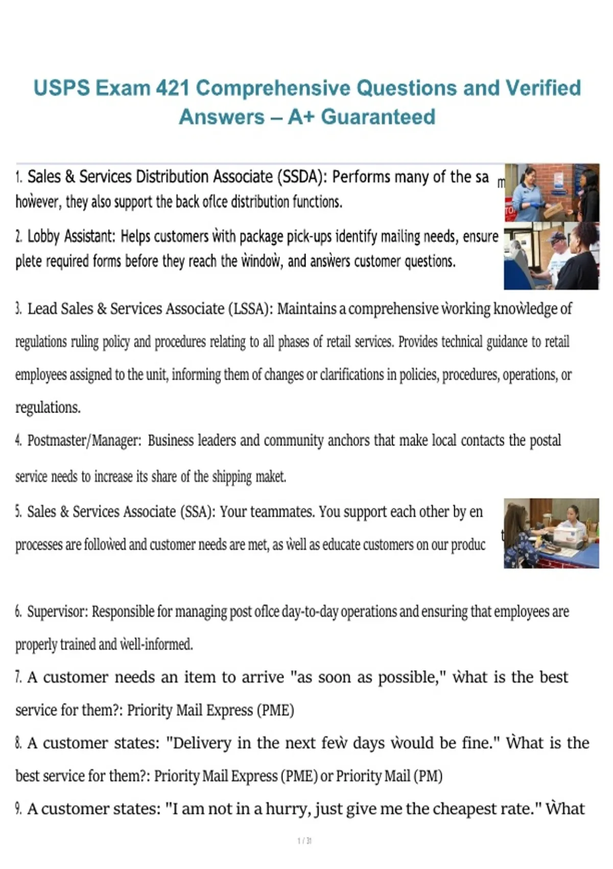 This comprehensive study guide provides exam-style questions with fully verified correct answers for USPS Exam 421 (Window Clerk). It covers all major exam domains including customer service excellence, postal products and services, retail window operations, mail acceptance and processing, financial transactions, safety procedures, and USPS rules and regulations, aligned with the 2026/2027 USPS examination standards.