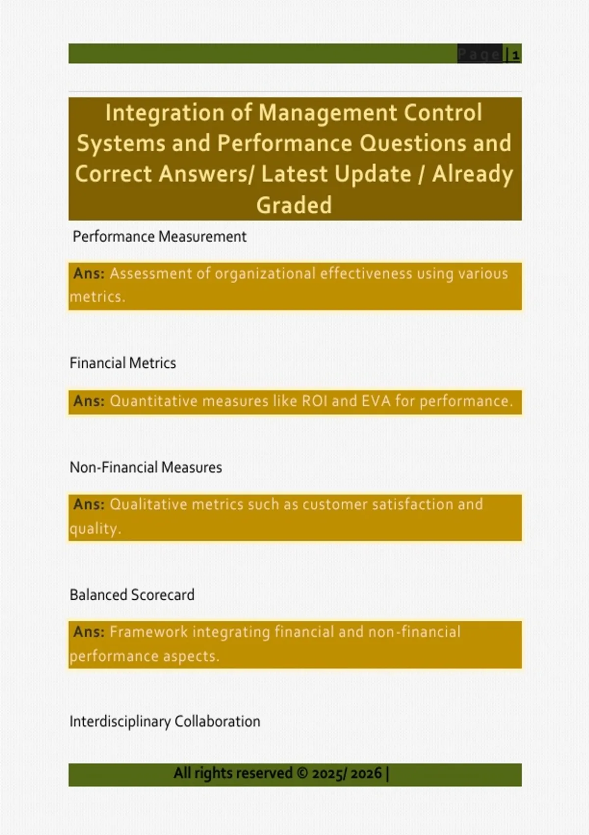 Integration of Management Control Systems and Performance Questions and Correct Answers/ Latest Update / Already Graded