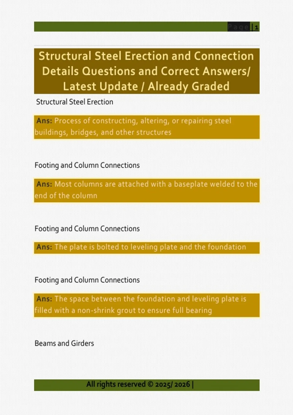 Structural Steel Erection and Connection Details Questions and Correct Answers/ Latest Update / Already Graded