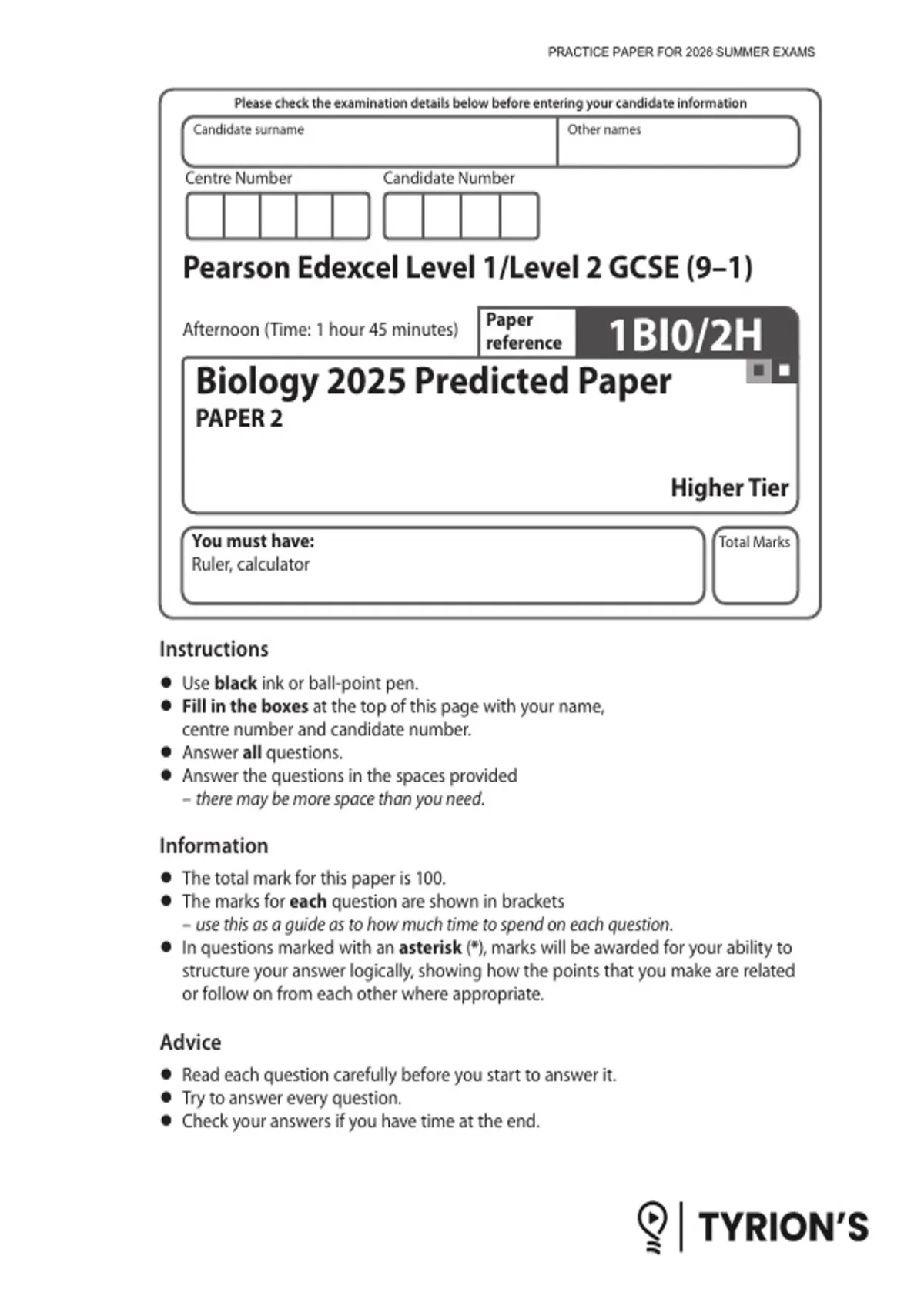 Edexcel GCSE Biology Question Paper 2H 2025 Predicted 2026 PRACTICE PAPER