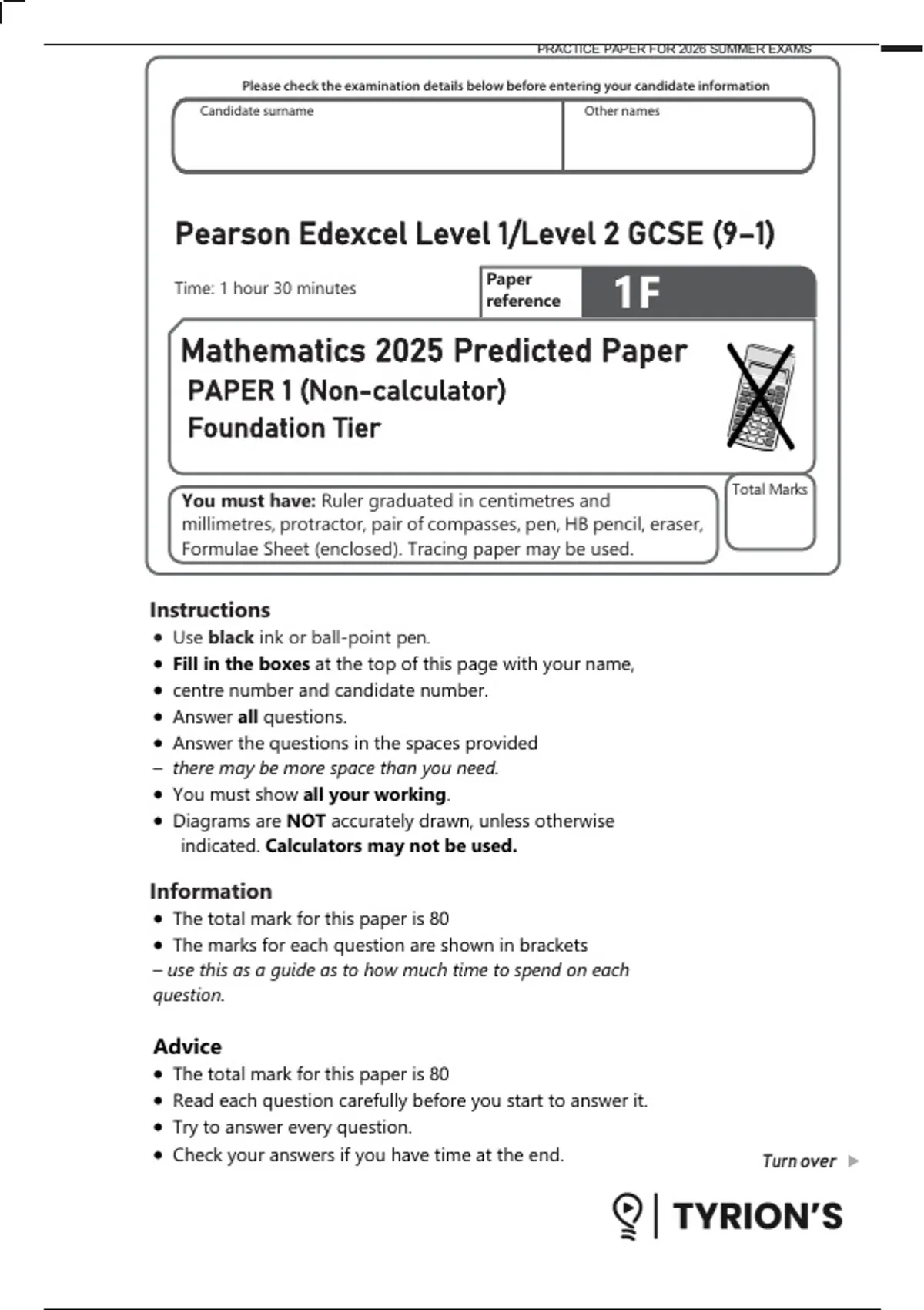EDEXCEL GCSE MATHEMATICS 1F 2025 PREDICTED QUESTION PAPER 2026 PRACTICE PAPER