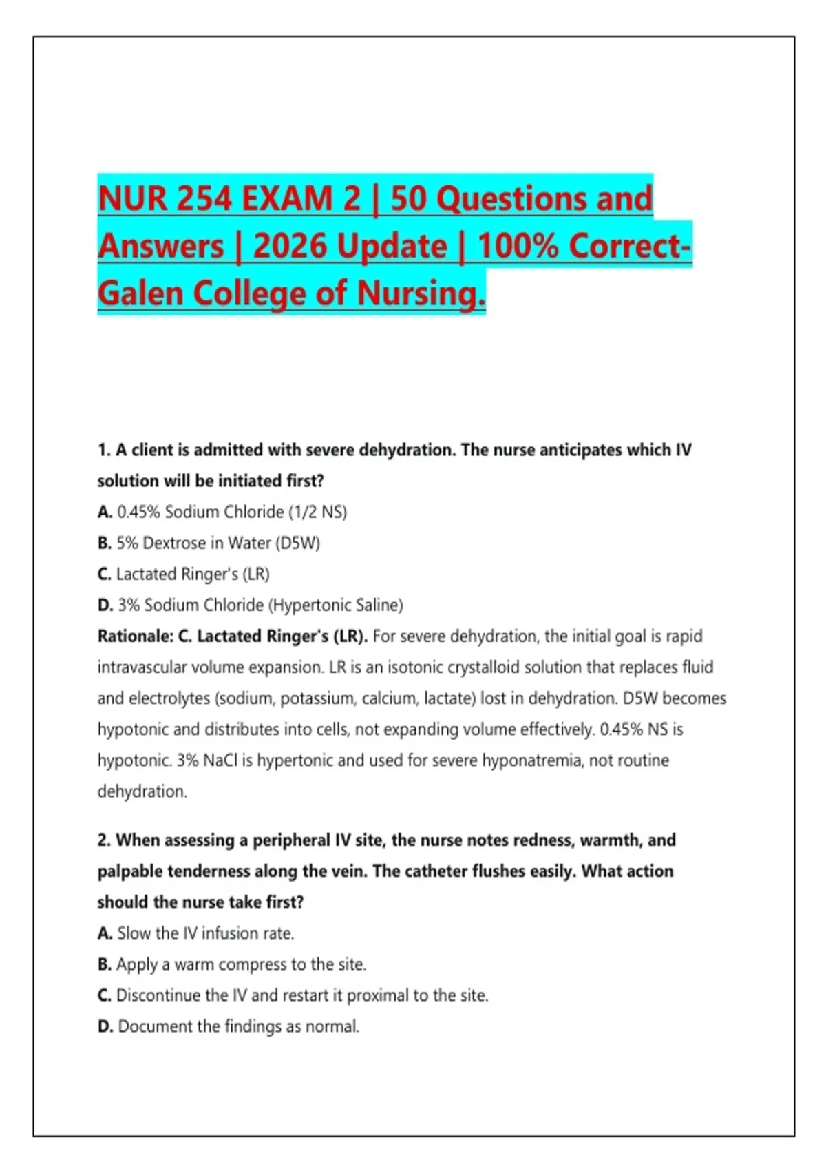 NUR 254 EXAM 2 | 50 Questions and Answers | 2026 Update | 100% CorrectGalen College of Nursing.