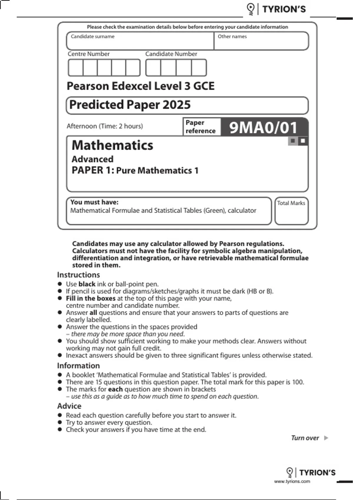 Candidates may use any calculator allowed by Pearson regulations.