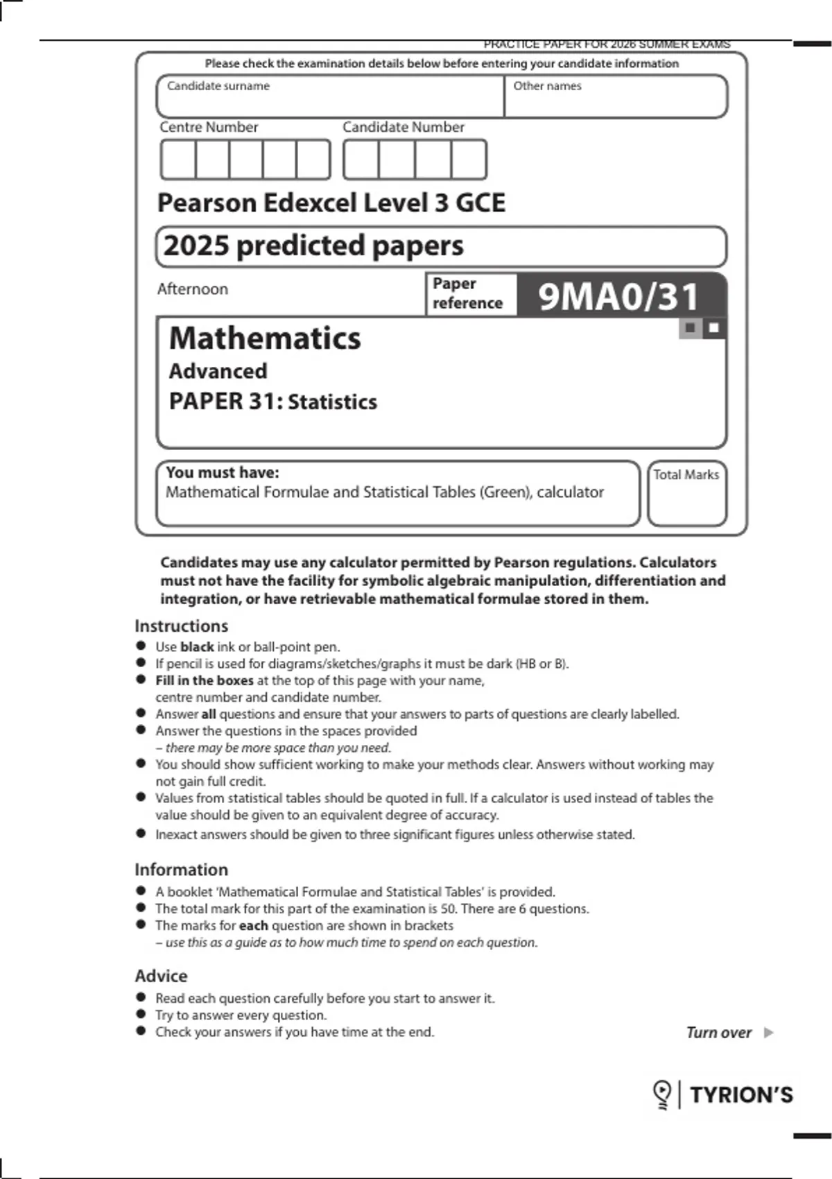 EDEXCEL A LEVEL MATHS 2025 PREDICTED PAPER 32 STAT QP 2026 PRACTICE PAPER