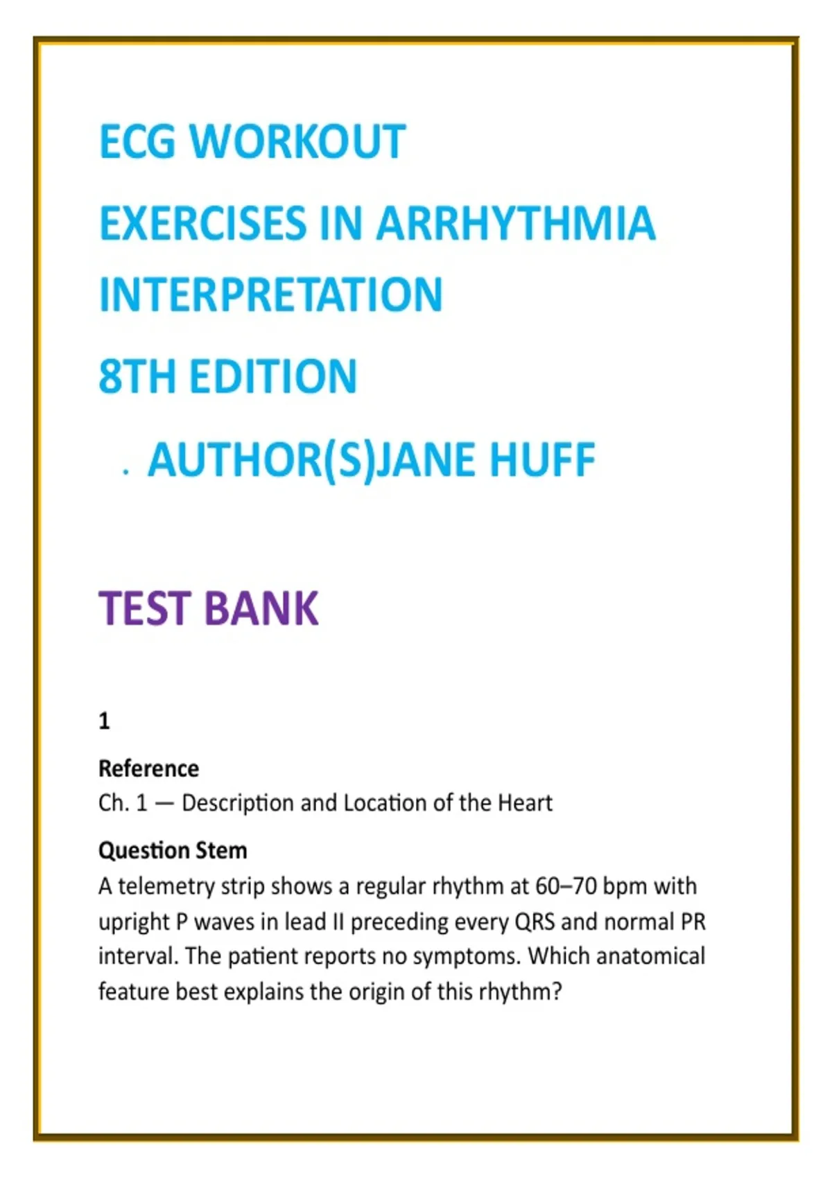 ECG Workout Test Bank 2026 – Jane Huff | Arrhythmia Interpretation & Cardiac Monitoring MCQs for Nursing 2) SEO Product Description (200–300 words) Master ECG interpretation with confidence using this comprehensive ECG Workout Test Bank based on ECG Workout: Exercises in Arrhythmia Interpretation, 8th Edition by Jane Huff—the gold standard for learning cardiac rhythms. Designed for nursing and allied health students, this digital test bank delivers full textbook coverage with 20 high-quality ECG interpretation MCQs per chapter, each paired with step-by-step clinical rationales that reinforce safe, accurate rhythm analysis. Built to support real-world cardiac monitoring and exam success, this resource emphasizes systematic waveform interpretation (rate, rhythm, P waves, PR interval, QRS width) and clinical correlation. Learners progress from foundational rhythm recognition to advanced arrhythmia differentiation, strengthening decision-making skills essential for patient safety in telemetry, emergency, and critical care settings. Ideal for courses in: ECG Interpretation & Cardiac Monitoring Medical-Surgical Nursing (Cardiovascular) Critical Care & Emergency Nursing Telemetry & Progressive Care Paramedic and Allied Health ECG programs What’s included: FULL coverage of all ECG Workout units and rhythm categories 20 ECG & arrhythmia MCQs per chapter Verified answers with clear, exam-focused rationales Progressive difficulty (basic → advanced rhythms) NCLEX-style clinical scenarios emphasizing patient safety Whether you’re preparing for exams or sharpening bedside monitoring skills, this Jane Huff ECG Workout test bank saves study time, builds rhythm recognition accuracy, and boosts confidence where it matters most—clinical practice and high-stakes testing. 3) 8 High-Value SEO Keywords ECG Workout test bank Jane Huff ECG test bank arrhythmia interpretation MCQs cardiac monitoring practice questions ECG interpretation nursing test bank ECG rhythm analysis questions nursing ECG practice 2026 telemetry ECG test bank 4) 10 Hashtags #ECGWorkout #ECGInterpretation #ArrhythmiaPractice #NursingTestBank #CardiacMonitoring #TelemetryNursing #MedSurgNursing #CriticalCareNursing #NCLEXPrep #AlliedHealthEducation
