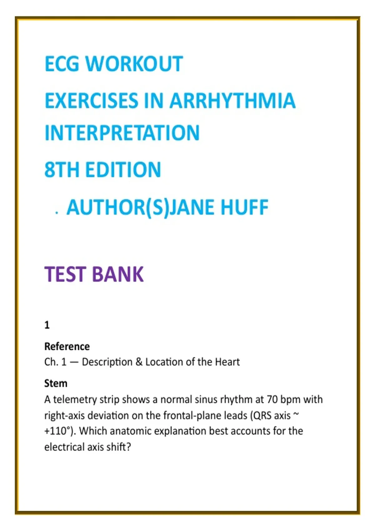 ECG Workout Test Bank (8th Ed) – Jane Huff | Arrhythmia Interpretation & Cardiac Monitoring MCQs for Nursing 2026 2) SEO Product Description (200–300 words) Master ECG interpretation with confidence using this comprehensive ECG Workout Test Bank based on Jane Huff’s ECG Workout: Exercises in Arrhythmia Interpretation (8th Edition)—a gold-standard resource trusted in nursing and allied health education worldwide. This exam-focused digital test bank delivers full textbook coverage across ALL units and rhythm categories, providing 20 clinically accurate ECG interpretation and arrhythmia analysis questions per chapter. Each question is paired with clear, step-by-step rationales that walk learners through rhythm recognition, waveform analysis, and safe clinical decision-making. Designed for efficiency and depth, this resource supports progressive ECG mastery—from foundational rhythm identification to advanced dysrhythmia differentiation—making it ideal for both first-time learners and exam revision. The questions emphasize real telemetry scenarios, patient safety considerations, and common exam traps seen in nursing and cardiac monitoring assessments. Key Features Full-chapter coverage of ECG Workout (8th Edition) 20 ECG & arrhythmia MCQs per chapter Detailed clinical rationales for every answer Progressive difficulty: basic → advanced rhythm interpretation Focus on cardiac decision-making and patient safety Digital format for fast, repeatable practice Ideal For Courses & Learners ECG Interpretation & Cardiac Monitoring Medical-Surgical Nursing (Cardiovascular Units) Critical Care & Emergency Nursing Telemetry & Step-Down Units Paramedic & Allied Health ECG Programs This test bank is a time-saving, confidence-building tool for students preparing for exams, clinical placements, and real-world cardiac monitoring responsibilities. 3) 8 High-Value SEO Keywords ECG Workout test bank Jane Huff ECG practice questions arrhythmia interpretation MCQs cardiac monitoring test bank ECG interpretation nursing exam telemetry ECG practice questions nursing ECG study guide cardiac rhythm analysis MCQs 4) 10 Hashtags #ECGWorkout #ECGInterpretation #ArrhythmiaPractice #CardiacMonitoring #NursingTestBank #TelemetryNursing #MedSurgNursing #CriticalCareNursing #ECGPracticeQuestions #NursingExamPrep