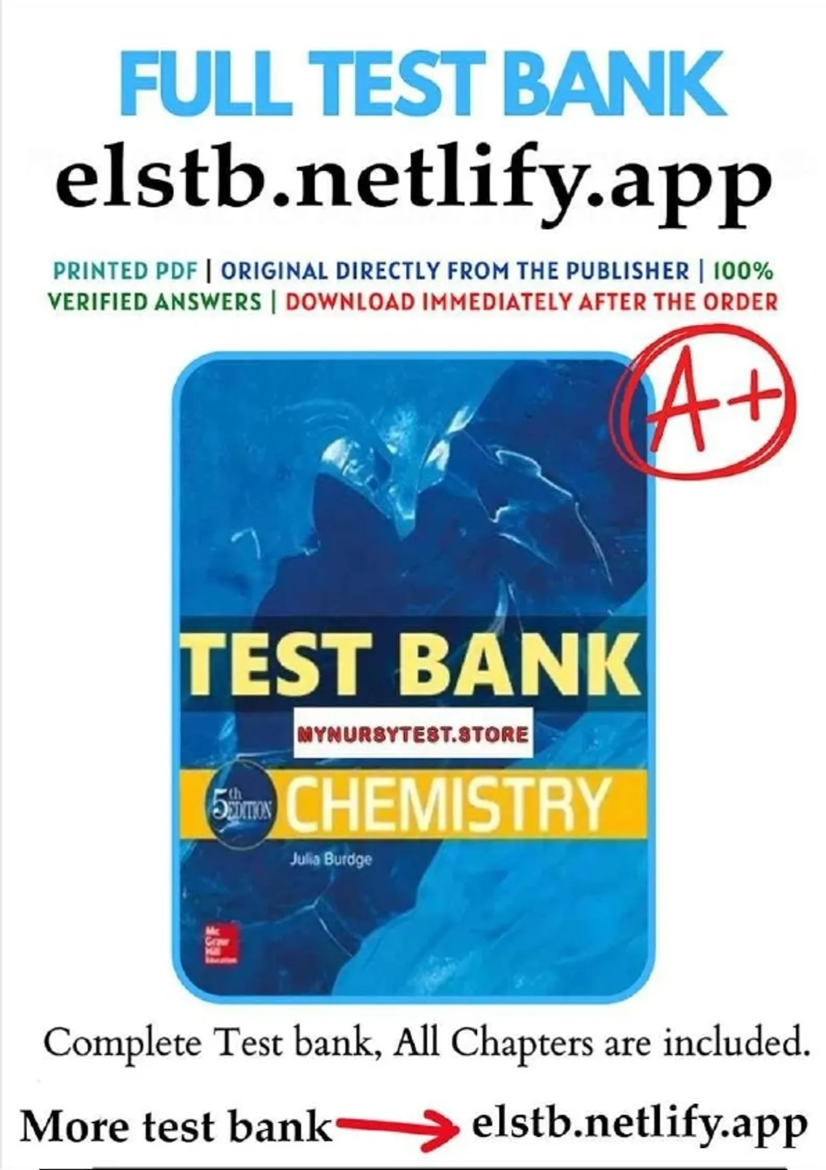 This Latest 2026 Test Bank for Chemistry 5th Edition by Burdge (Updated) is an essential academic resource designed to elevate the teaching and learning of college-level chemistry. Tailored to the structure and learning goals of the 5th edition, this test bank offers a rich collection of thoughtfully crafted questions across all core chapters — from atomic structure and chemical bonding to thermodynamics, equilibrium, kinetics, acids and bases, and beyond. The variety of question formats, including multiple choice, true/false, short answer, and applied problem solving, gives instructors the flexibility to build class quizzes, chapter exams, unit tests, and review assignments with confidence. For students, the test bank provides consistent practice that reinforces key concepts and enhances critical thinking skills needed for success in chemistry courses. Each item aligns with the textbook’s pedagogical approach, ensuring relevance and consistency throughout the semester. Whether used for classroom assessment, individual study, or review preparation, this updated test bank is a valuable tool for mastering foundational and advanced chemistry topics in a structured, effective way.