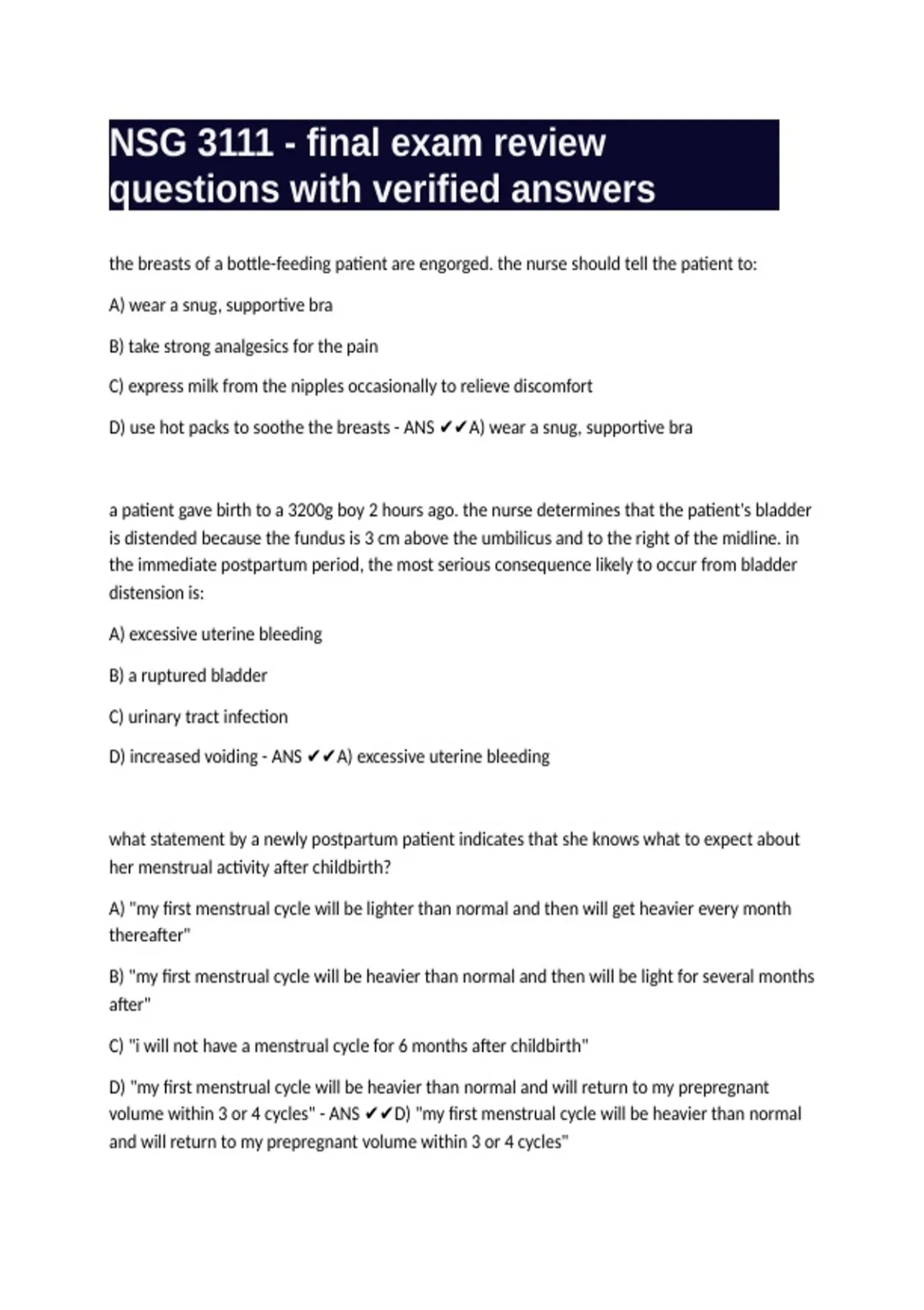 NSG 3111 - final exam review questions with verified answers