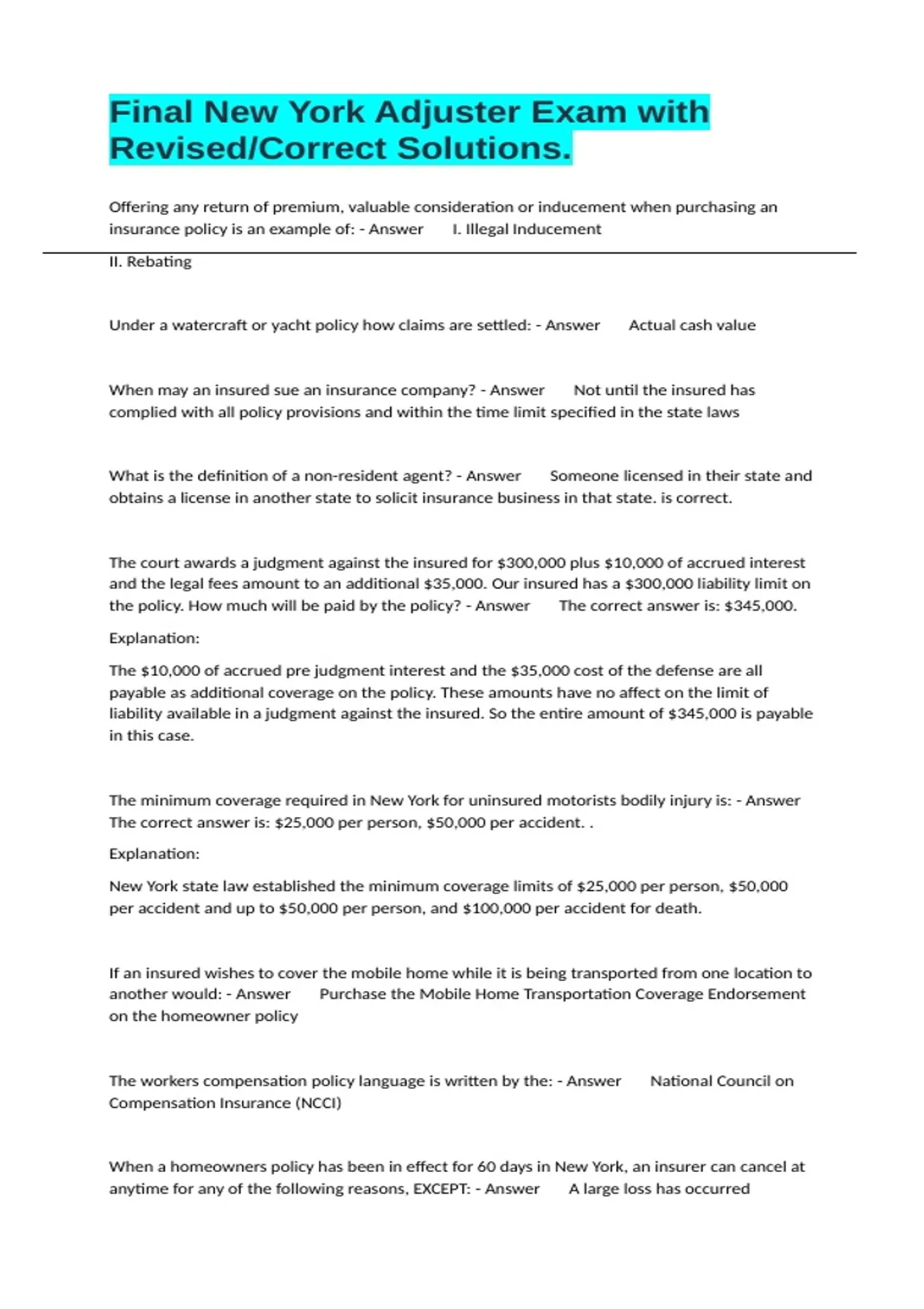 Offering any return of premium, valuable consideration or inducement when purchasing an insurance policy is an example of: - Answer I. Illegal Inducement II. Rebating Under a watercraft or yacht policy how claims are settled: - Answer Actual cash value When may an insured sue an insurance company? - Answer Not until the insured has complied with all policy provisions and within the time limit specified in the state laws What is the definition of a non-resident agent? - Answer Someone licensed in their state and obtains a license in another state to solicit insurance business in that state. is correct. The court awards a judgment against the insured for $300,000 plus $10,000 of accrued interest and the legal fees amount to an additional $35,000. Our insured has a $300,000 liability limit on the policy. How much will be paid by the policy? - Answer The correct answer is: $345,000. Explanation: The $10,000 of accrued pre judgment interest and the $35,000 cost of the defense are all payable as additional coverage on the policy. These amounts have no affect on the limit of liability available in a judgment against the insured. So the entire amount of $345,000 is payable in this case. The minimum coverage required in New York for uninsured motorists bodily injury is: - Answer The correct answer is: $25,000 per person, $50,000 per accident. . Explanation: New York state law established the minimum coverage limits of $25,000 per person, $50,000 per accident and up to $50,000 per person, and $100,000 per accident for death. If an insured wishes to cover the mobile home while it is being transported from one location to another would: - Answer Purchase the Mobile Home Transportation Coverage Endorsement on the homeowner policy The workers compensation policy language is written by the: - Answer National Council on Compensation Insurance (NCCI) When a homeowners policy has been in effect for 60 days in New York, an insurer can cancel at anytime for any of the following reasons, EXCEPT: - Answer A large loss has occurred
