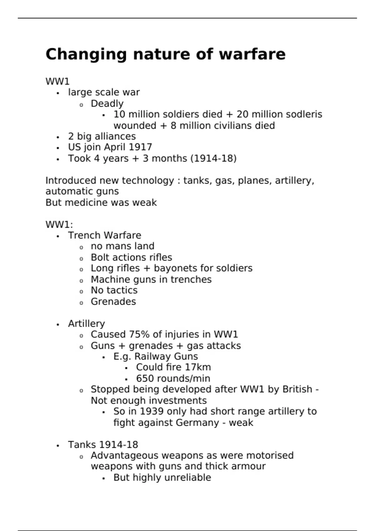 Summary Notes for changing nature of warfare iGCSE history Pearson Edexcel