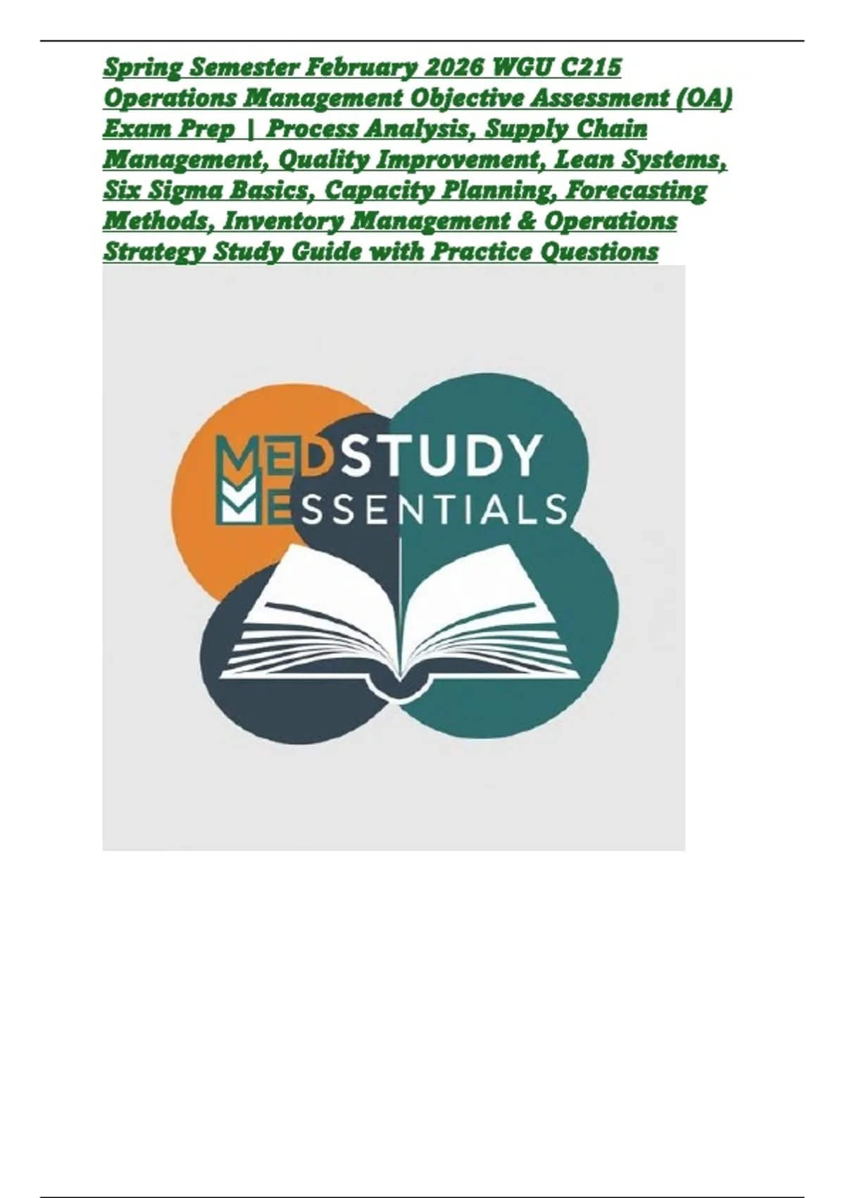 This WGU C215 Operations Management OA Exam Prep is built for Spring Semester February 2026 students preparing for their Objective Assessment. The guide simplifies key operations concepts including process analysis, supply chain management, quality improvement methods, Lean systems, Six Sigma fundamentals, capacity planning, demand forecasting, and inventory control strategies. Designed with exam-style practice questions and clear explanations, it helps learners understand how organizations improve efficiency, reduce waste, and optimize performance. Ideal for WGU students who want a focused, exam-aligned study resource to confidently pass C215 while mastering practical operations and process management skills used in real-world business environments.