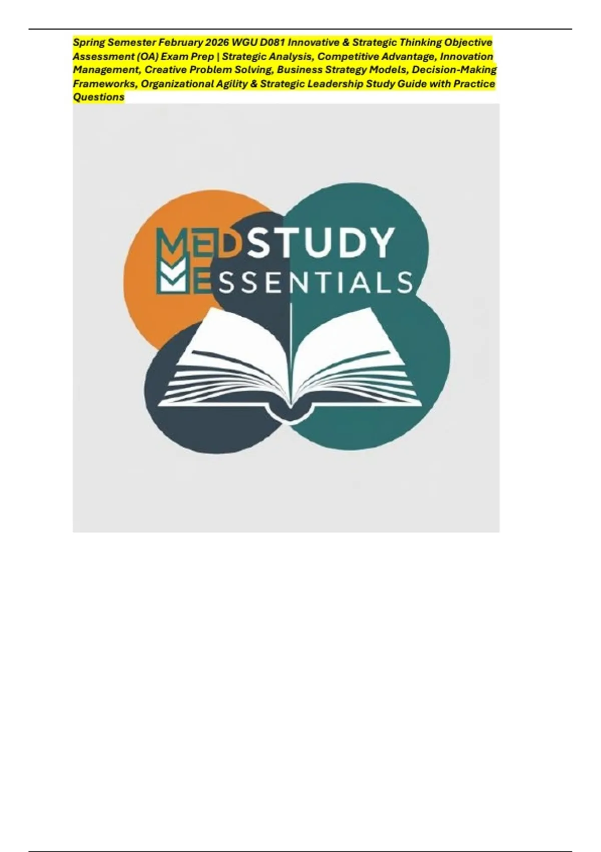 This WGU D081 Innovative & Strategic Thinking OA Exam Prep is tailored for Spring Semester February 2026 students preparing for the Objective Assessment. It covers core strategy and innovation concepts including strategic analysis tools, competitive advantage frameworks, innovation management principles, creative problem-solving methods, business strategy models, decision-making frameworks, and organizational agility. Built with exam-style practice questions and easy-to-understand explanations, this resource helps learners connect theory to real-world business strategy and leadership scenarios. Perfect for WGU students who want a focused, exam-aligned study guide to confidently pass D081 while strengthening high-level strategic thinking and innovation skills valued in modern organizations.