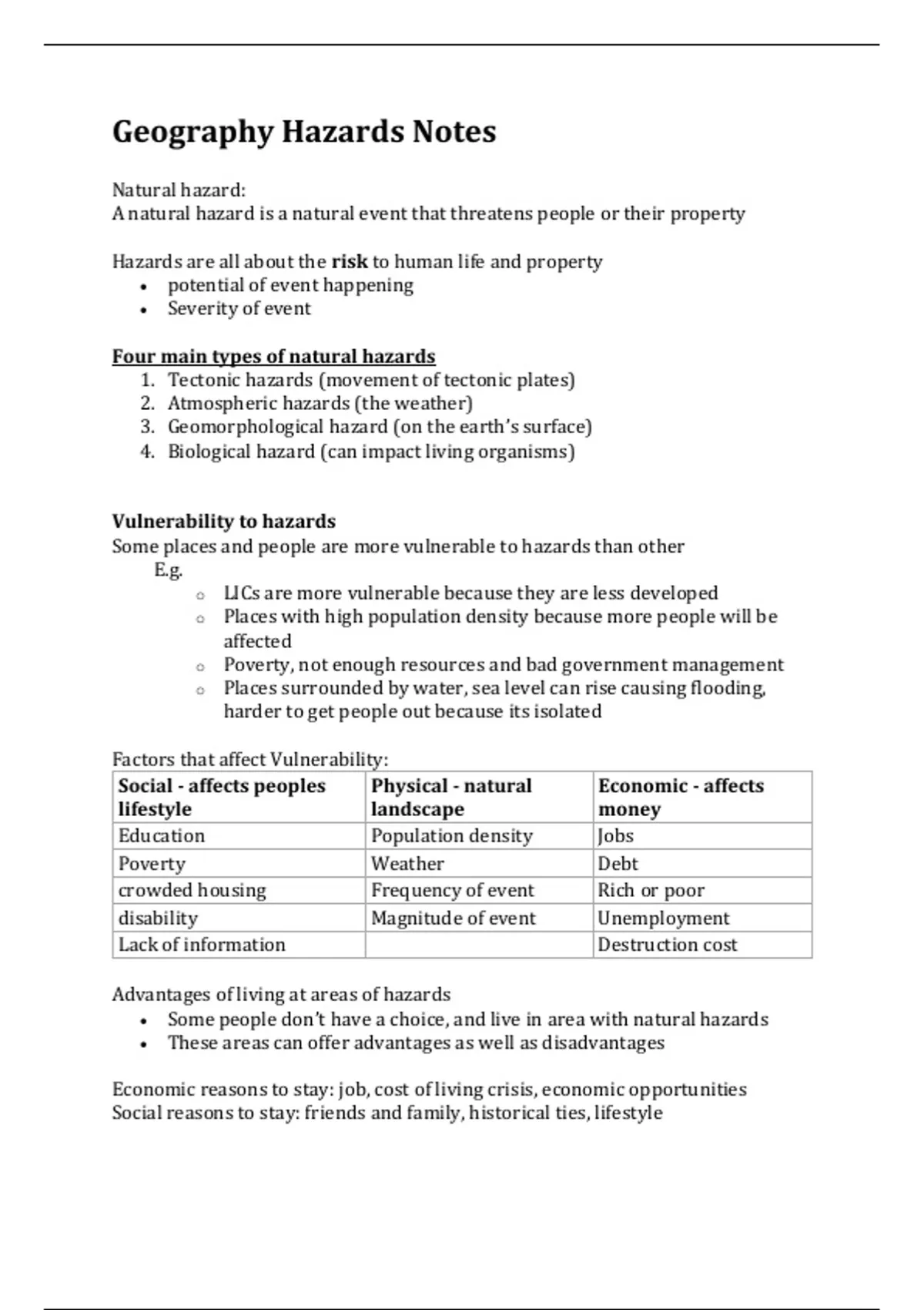 Summary Notes for geography Hazards iGCSE Pearson Edexcel